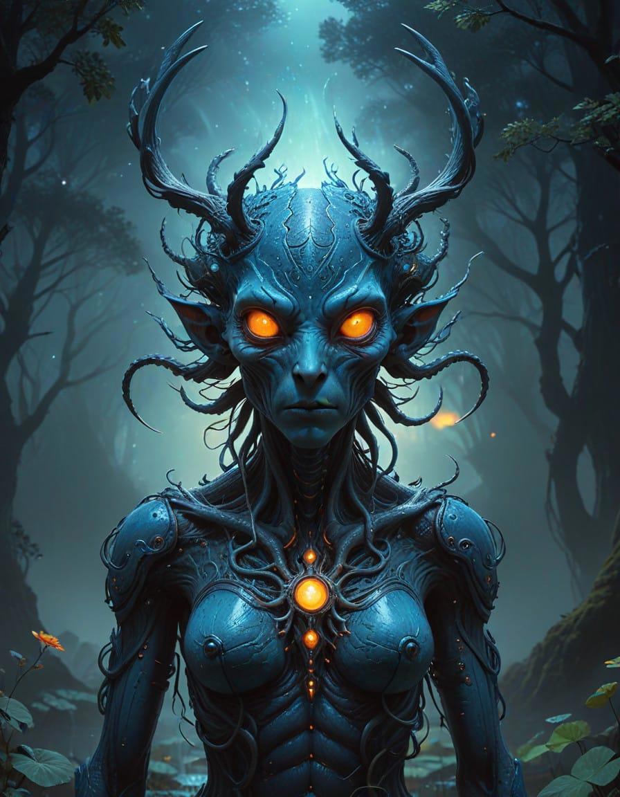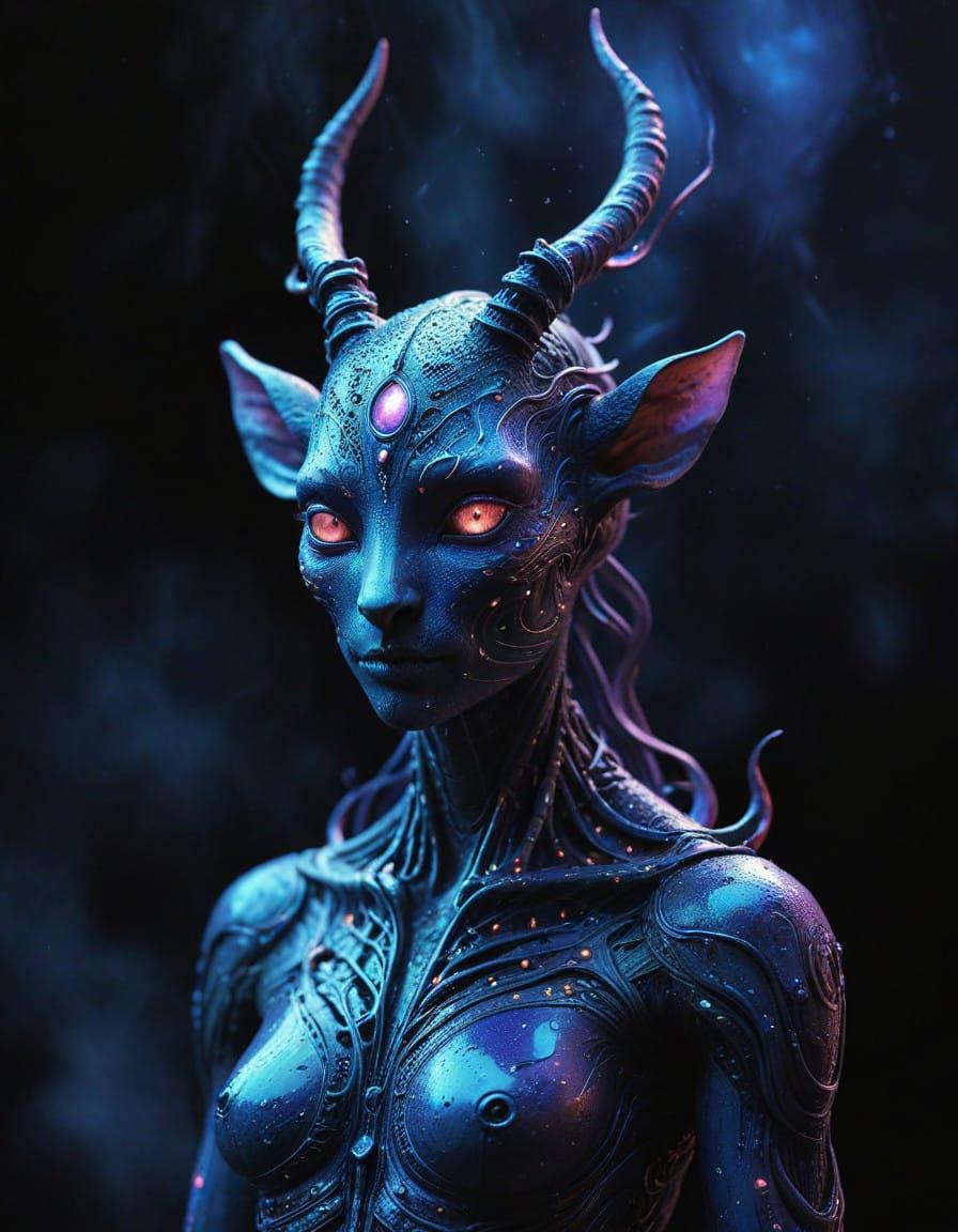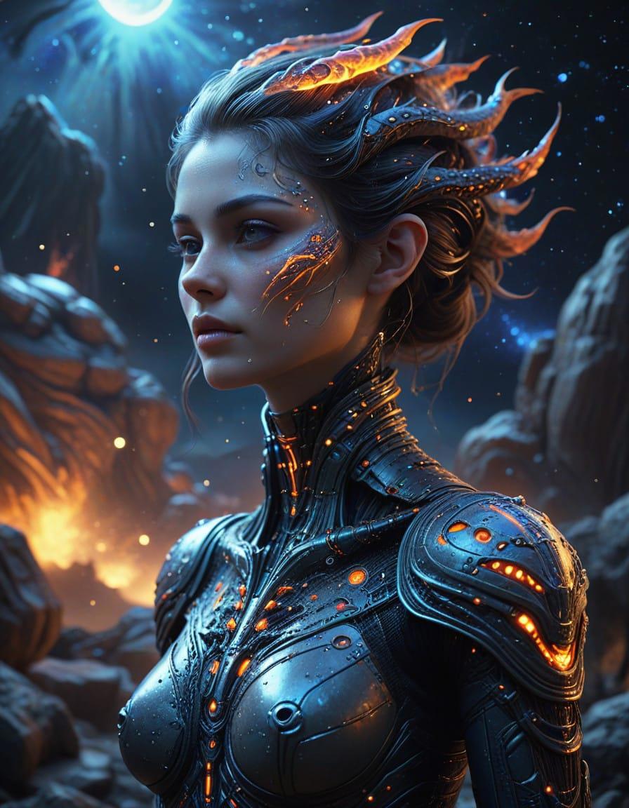 Elegant slim alien creature, portrait, extraterrestrial alien, adorable, light skin, galaxy, starry night, Irene Sheri, Hans Giger, Kerem Beyit