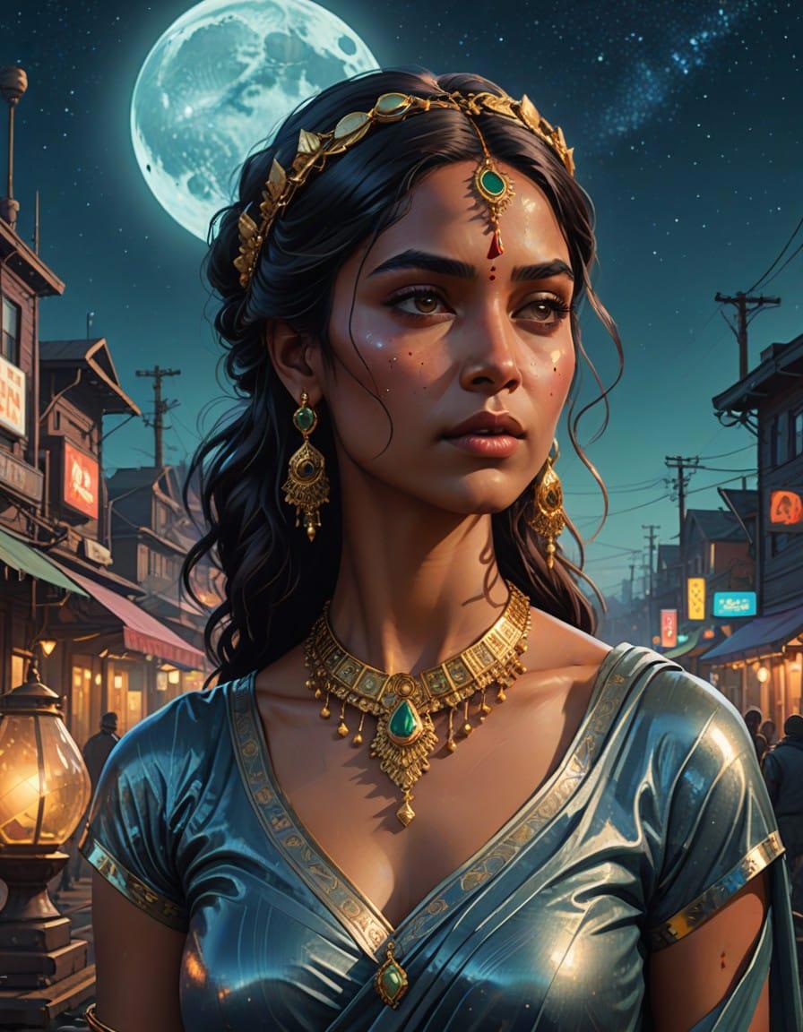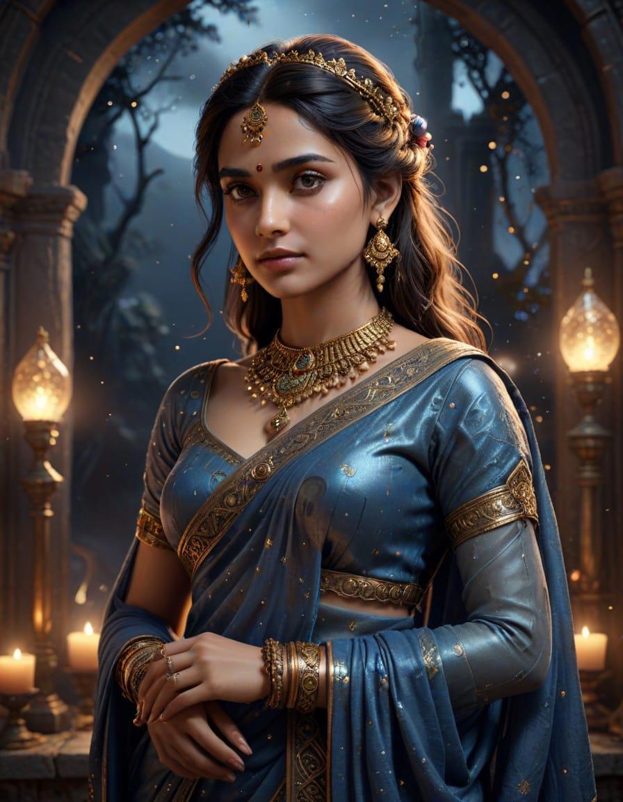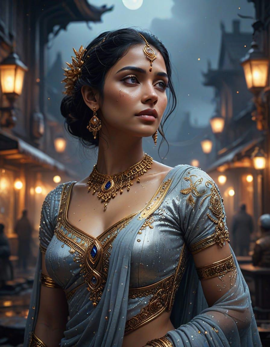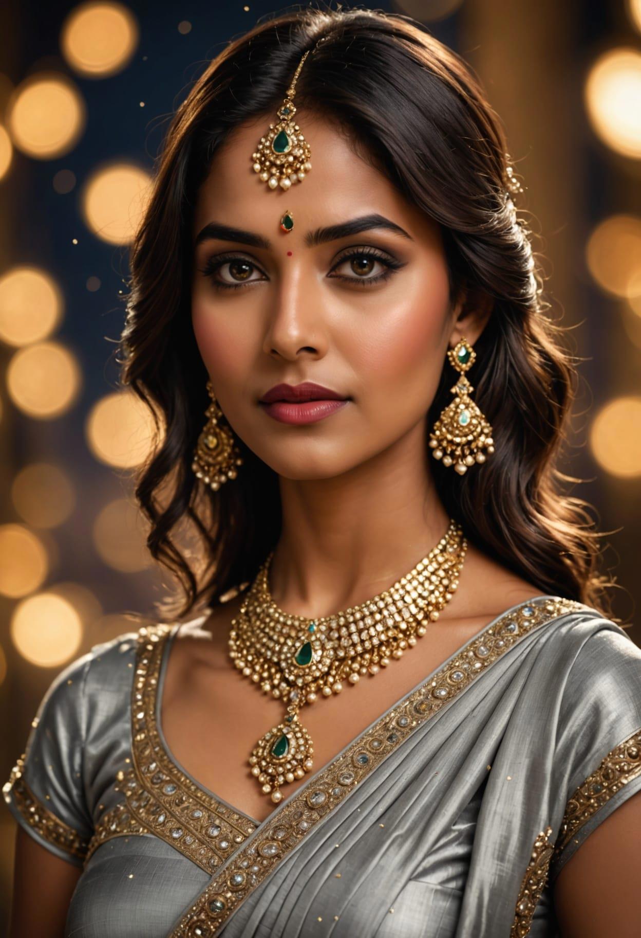 best quality, portrait, masterpiece, bokeh, detailed, photorealistic, ultra high res, intricate, hyperdetailed, Very attractive Indian woman Wearing Silver saree dress, gold jewelry, photo shoot, hourglass body, luscious lips, feminine, detailed, detailed face, outlined iris, perfect eyes, 4k, beautiful, dark space background, starry night