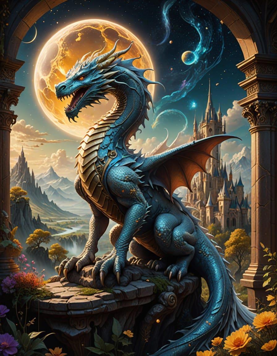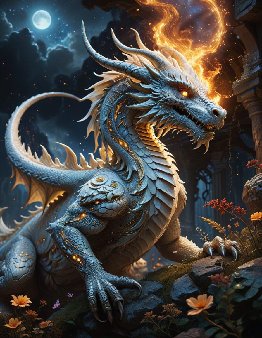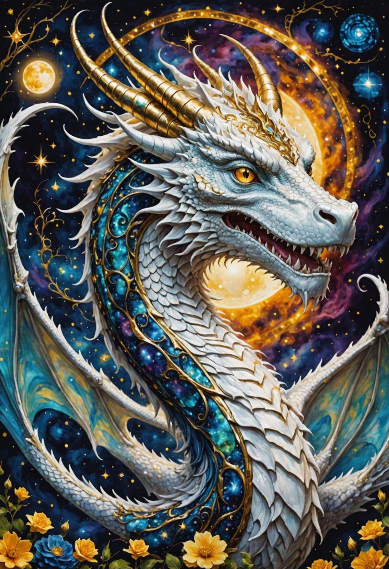 white dragon, portrait, sunshine, stargazing, galaxy, stars, Ciruelo Cabral, Gustav Klimt, Kerem Beyit, Alcohol ink with golden oil veins, backlit, inner illuminated, rococo painting, children book illustration, high detailed, intricate details