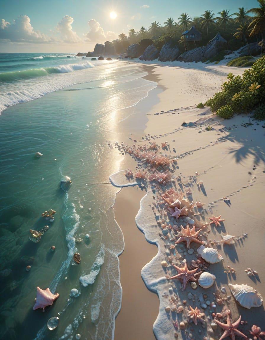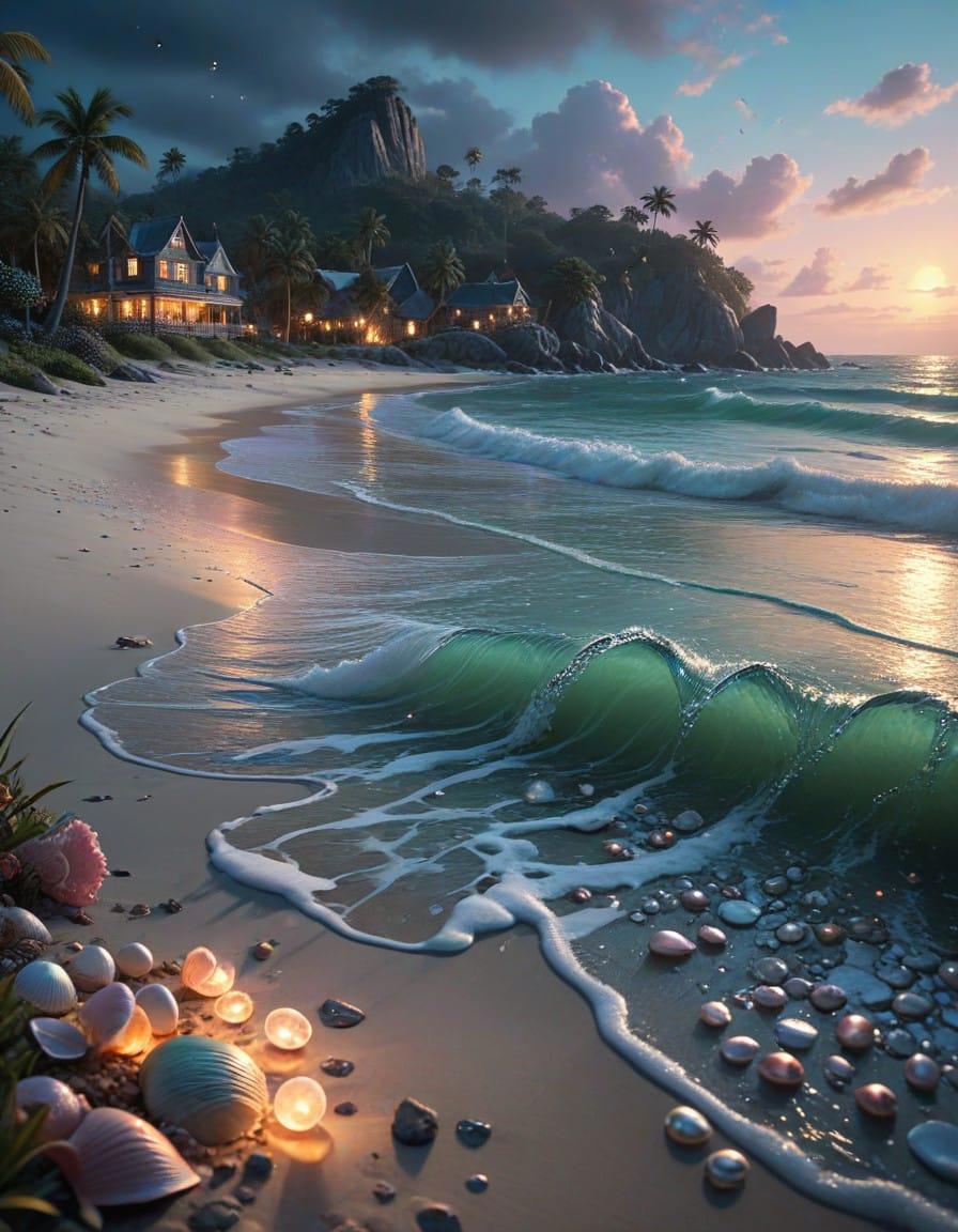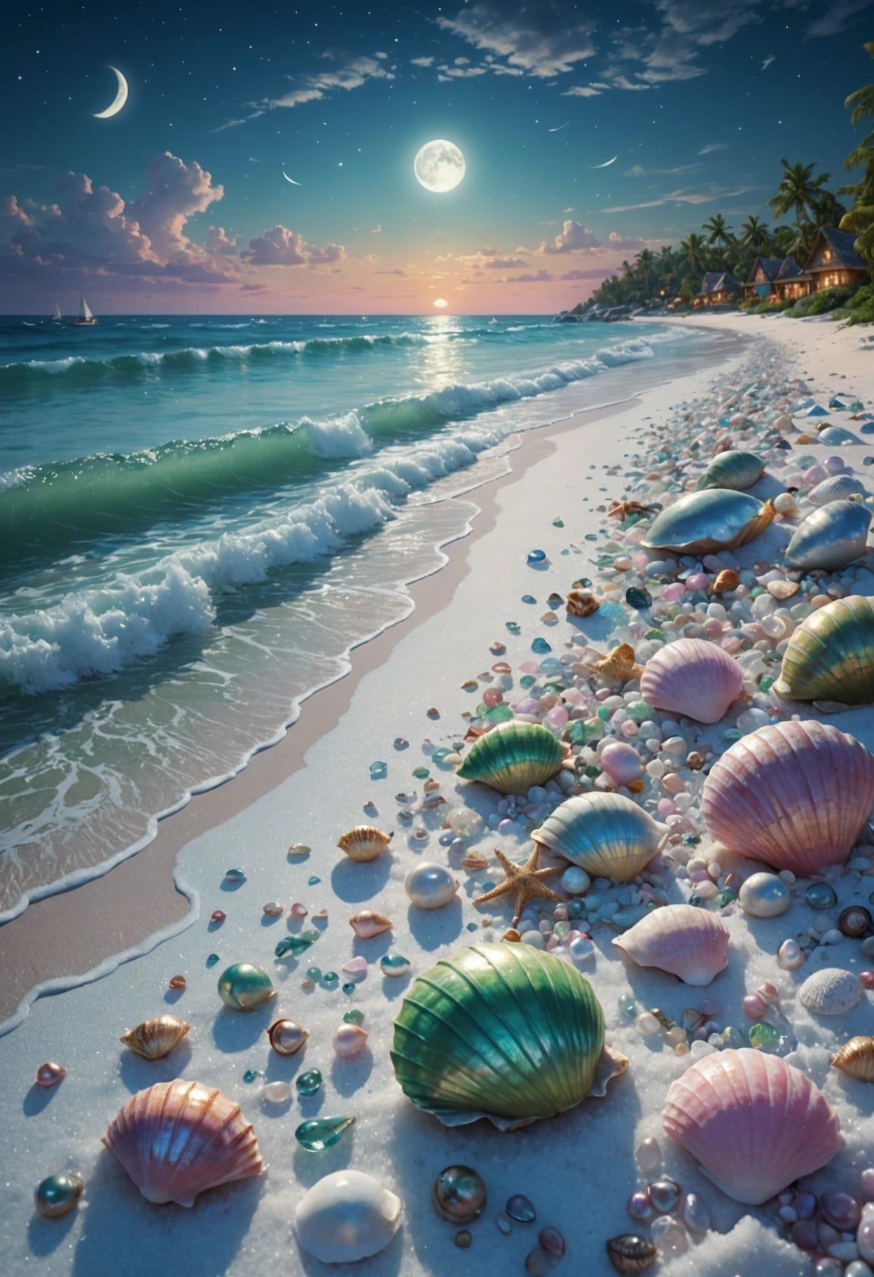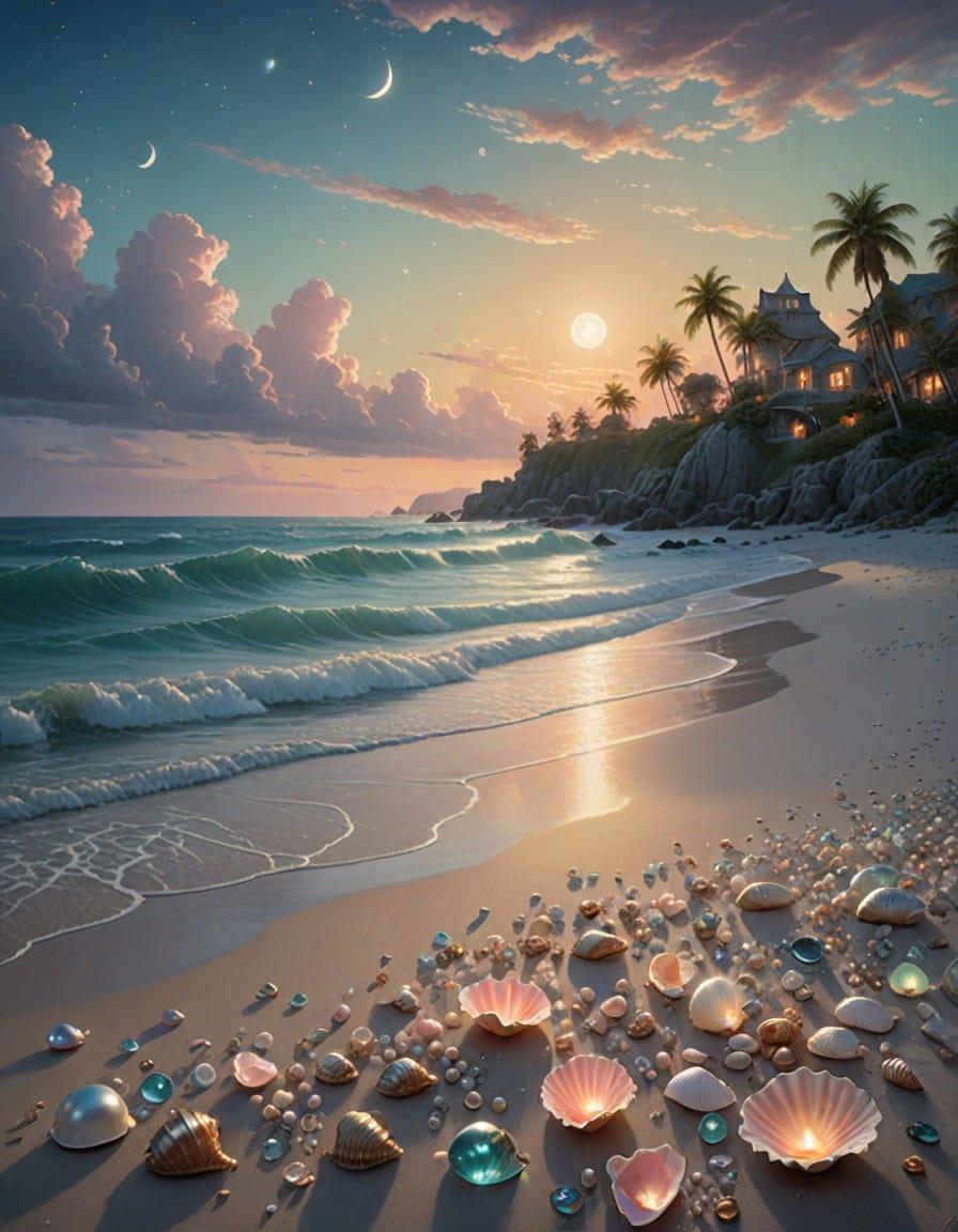Sea, beach, many beautiful pale green large shells and pale pink conch shells on the beach, crystal, moonlight shines on the snow white beach, blue sea, pearls, super details, fireflies, fairyland, thomas kinkade, krenz, victo nagi, cgsociety trends, soft light