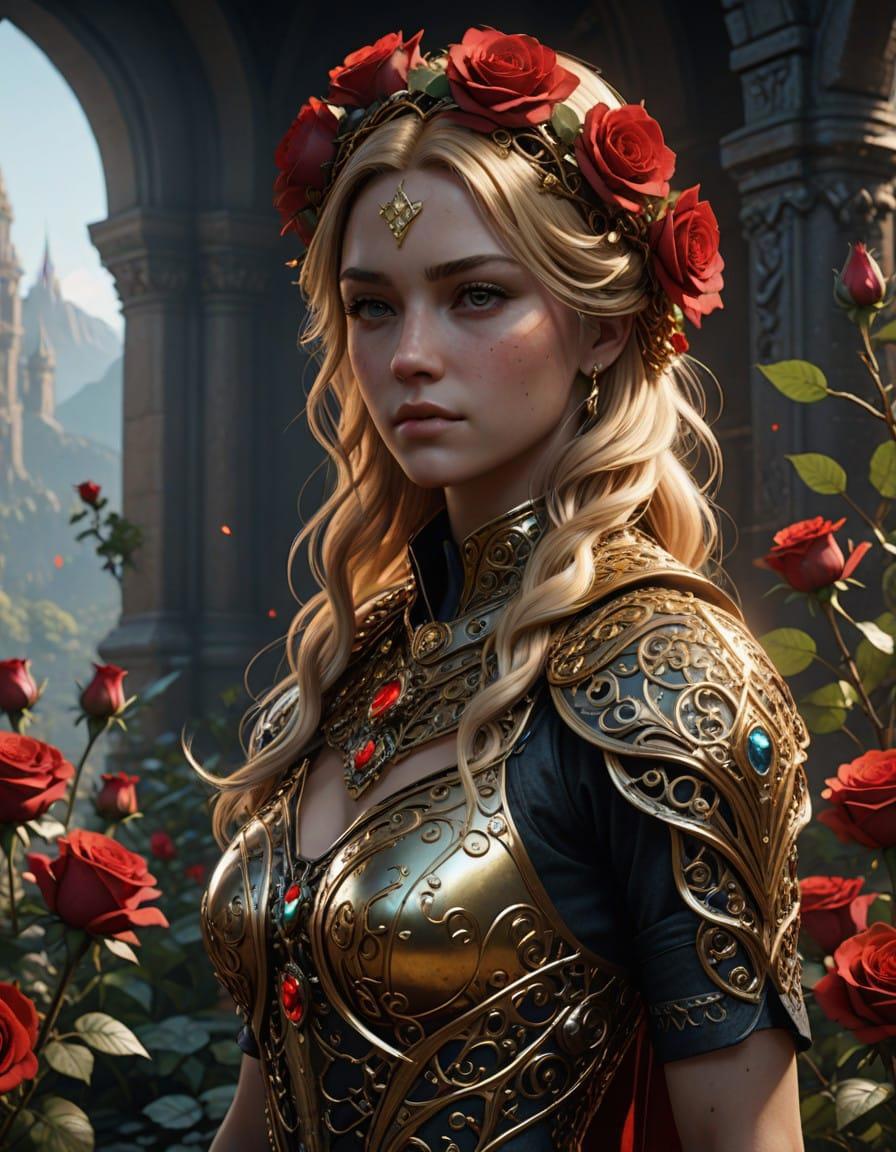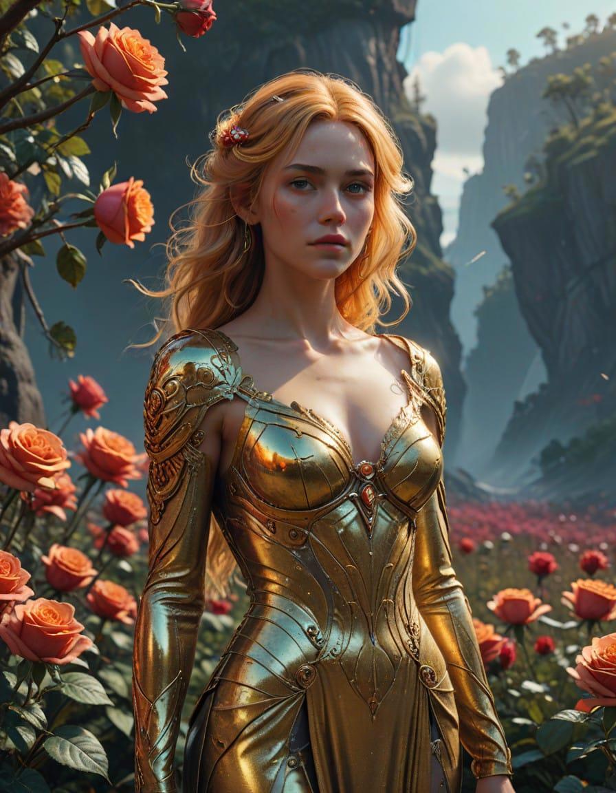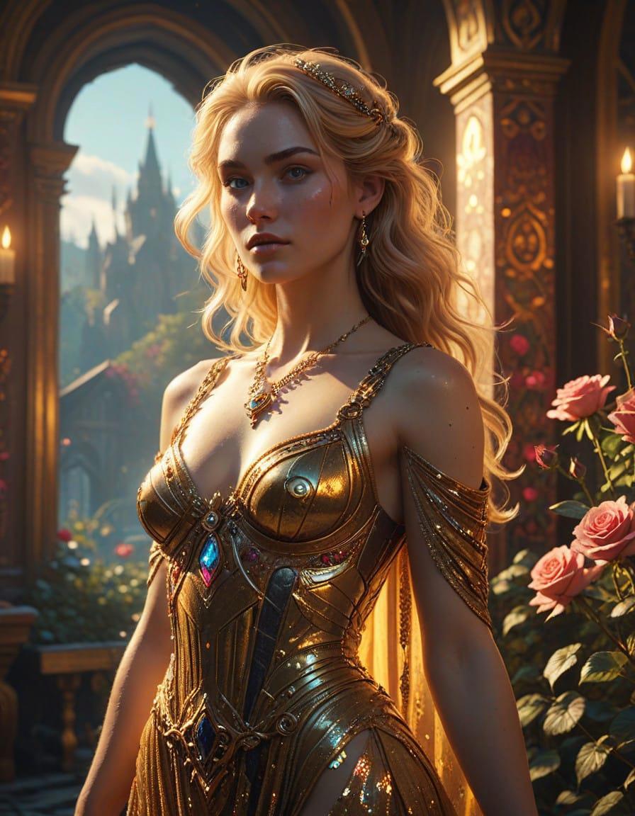 a heartcore goddess, beautiful with golden blonde hair, a fit and curvey gorgeous body, gold, diamonds, roses, beautiful, epic, cinematic