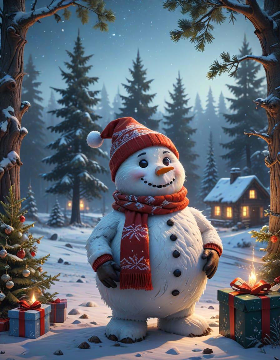 amazing winter landscape, night, snowflakes, Christmas fir-tree, snowman in red hat and mittens, scarf, gifts, close-up, oil painting style, high detailed, ultra realistic