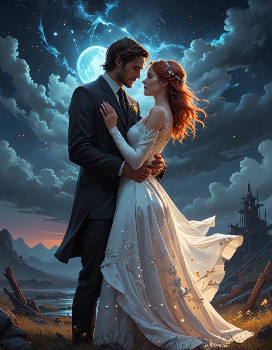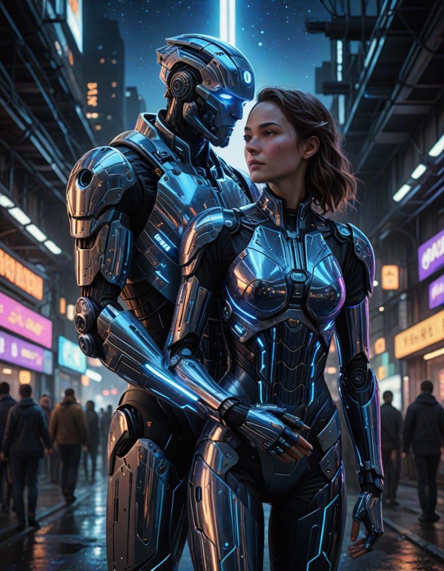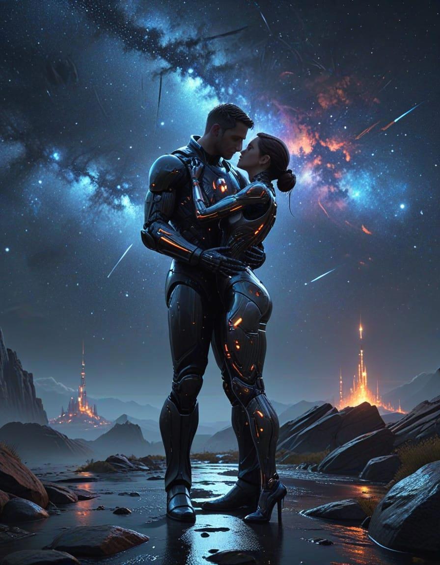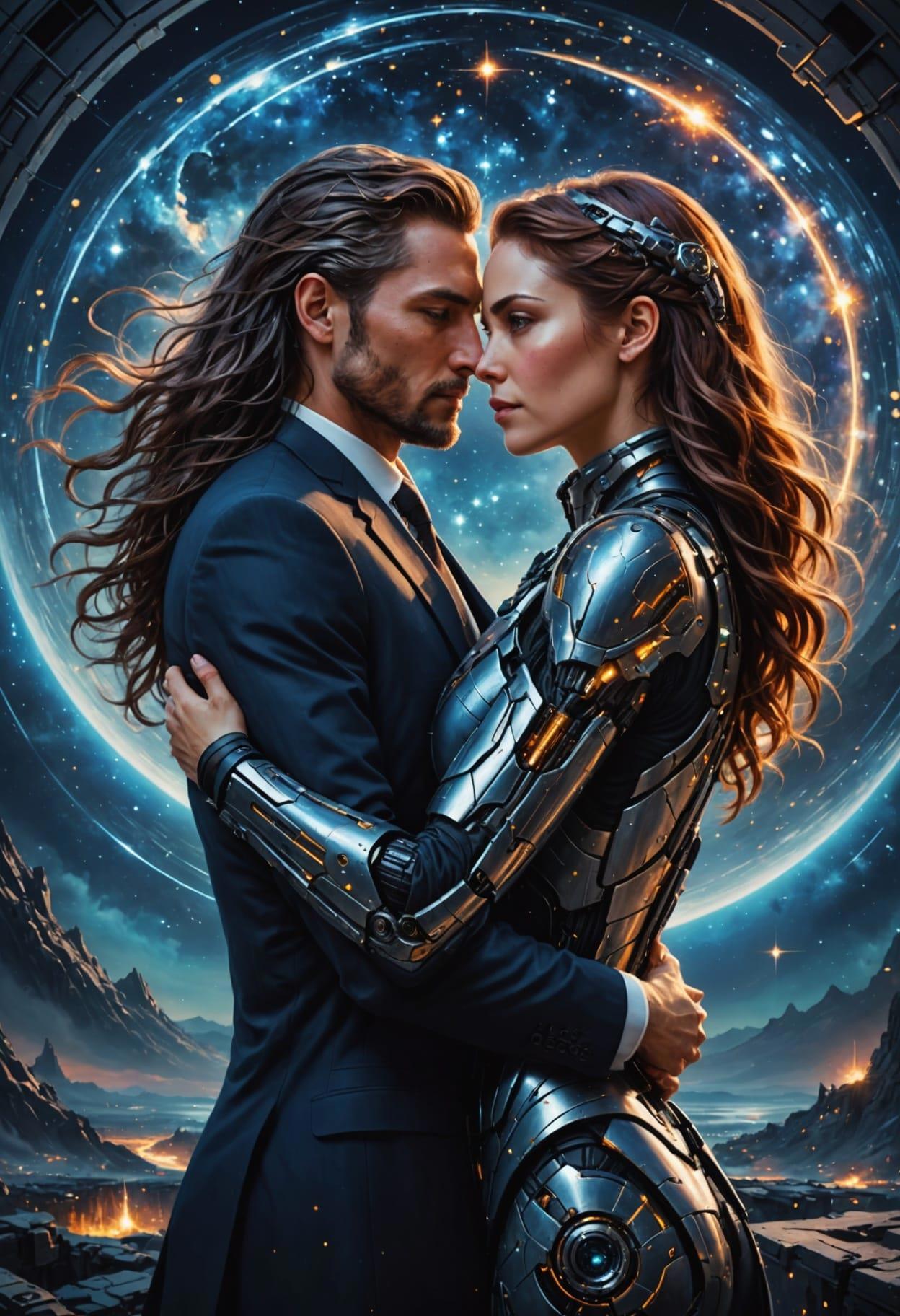 lady cyborg with human husband in suit, couple, hugs, in half a turn, beautiful, space background, starry night, realistic, high detailed, oil painting style