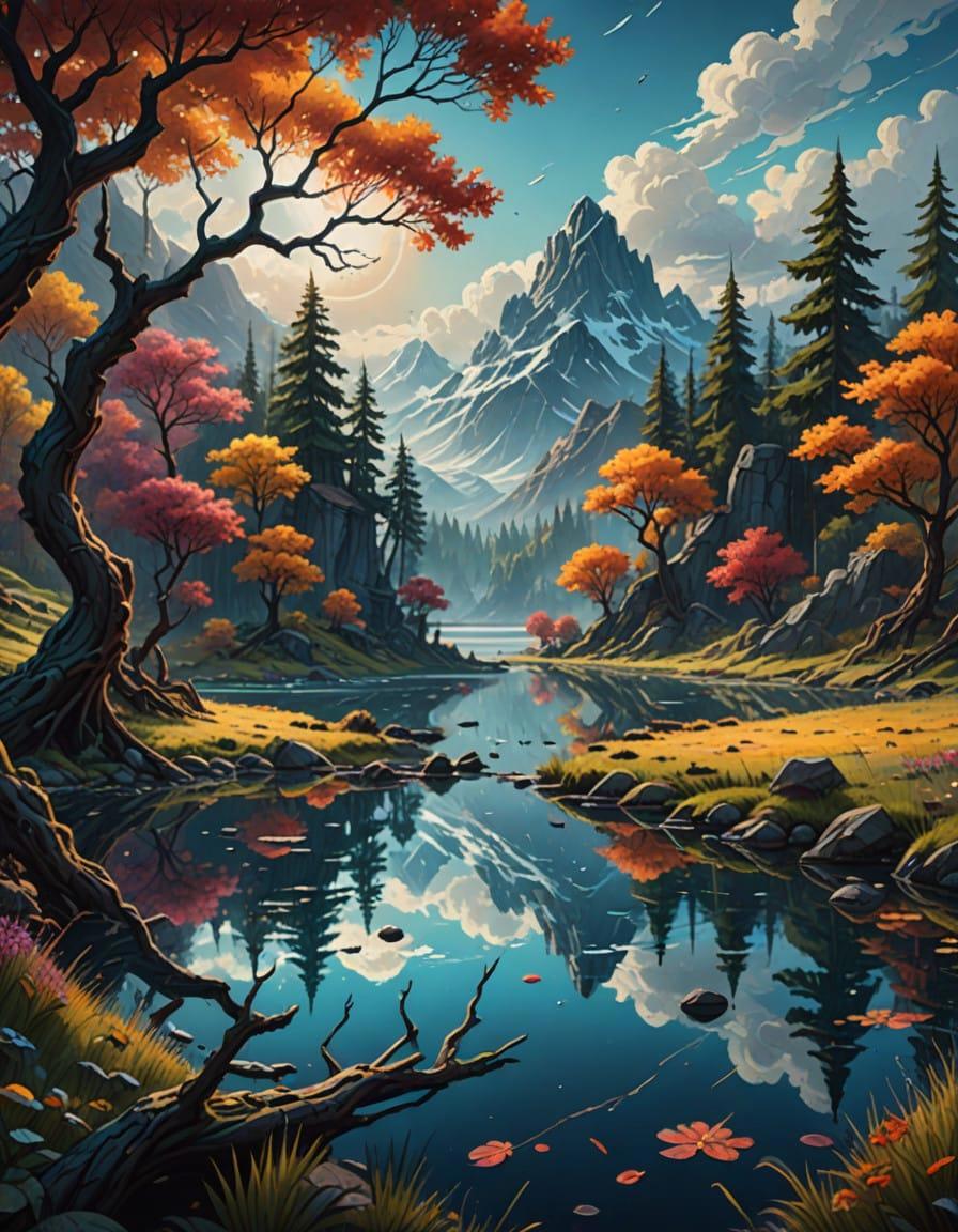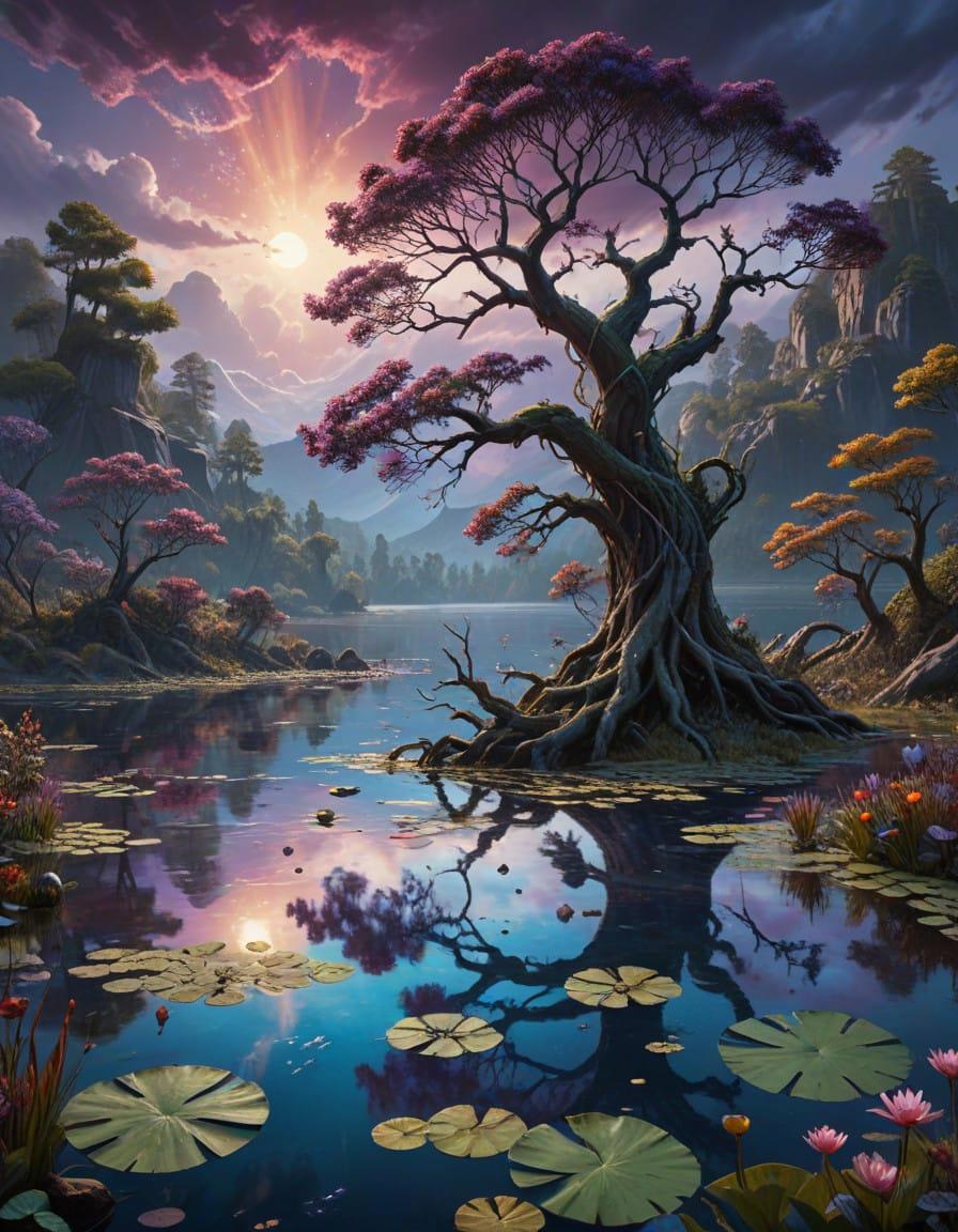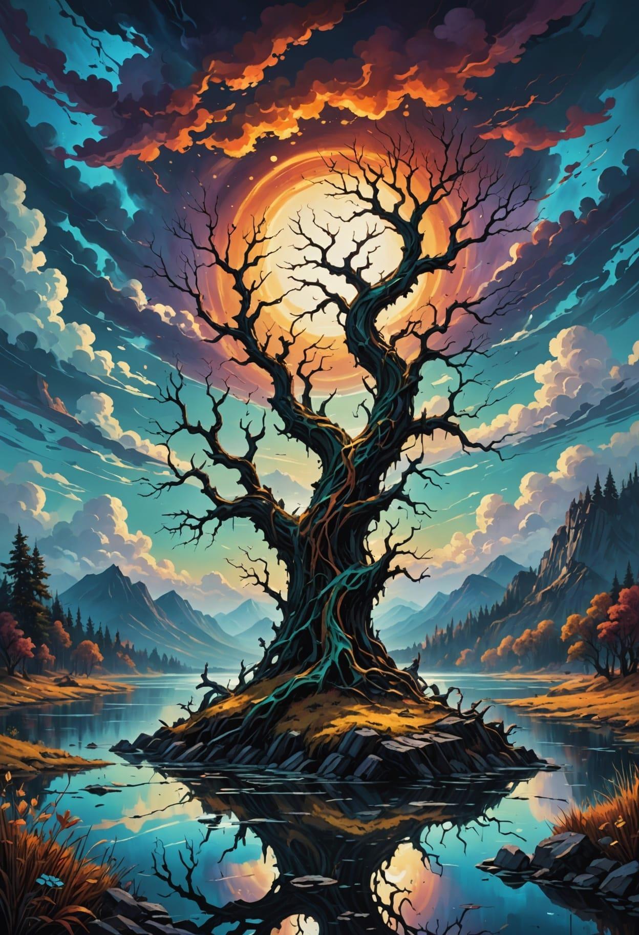 oil painting with a cloudy sky and lake, close-up, Dan Mumford, psychedelic illustration, Martiros Saryan, exaggerated scenes, twisted branches, high resolution