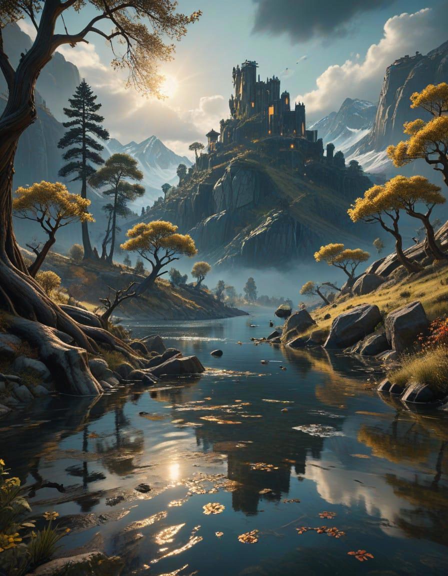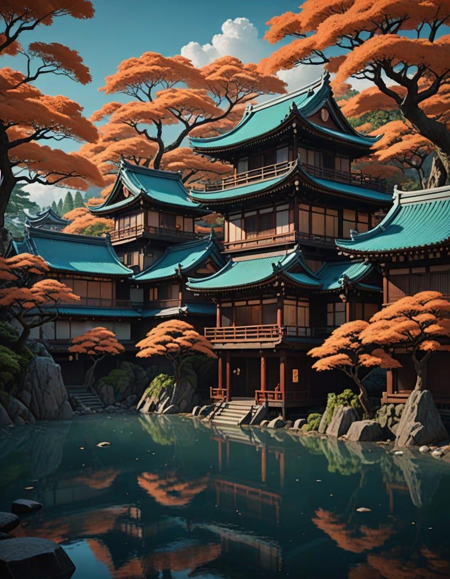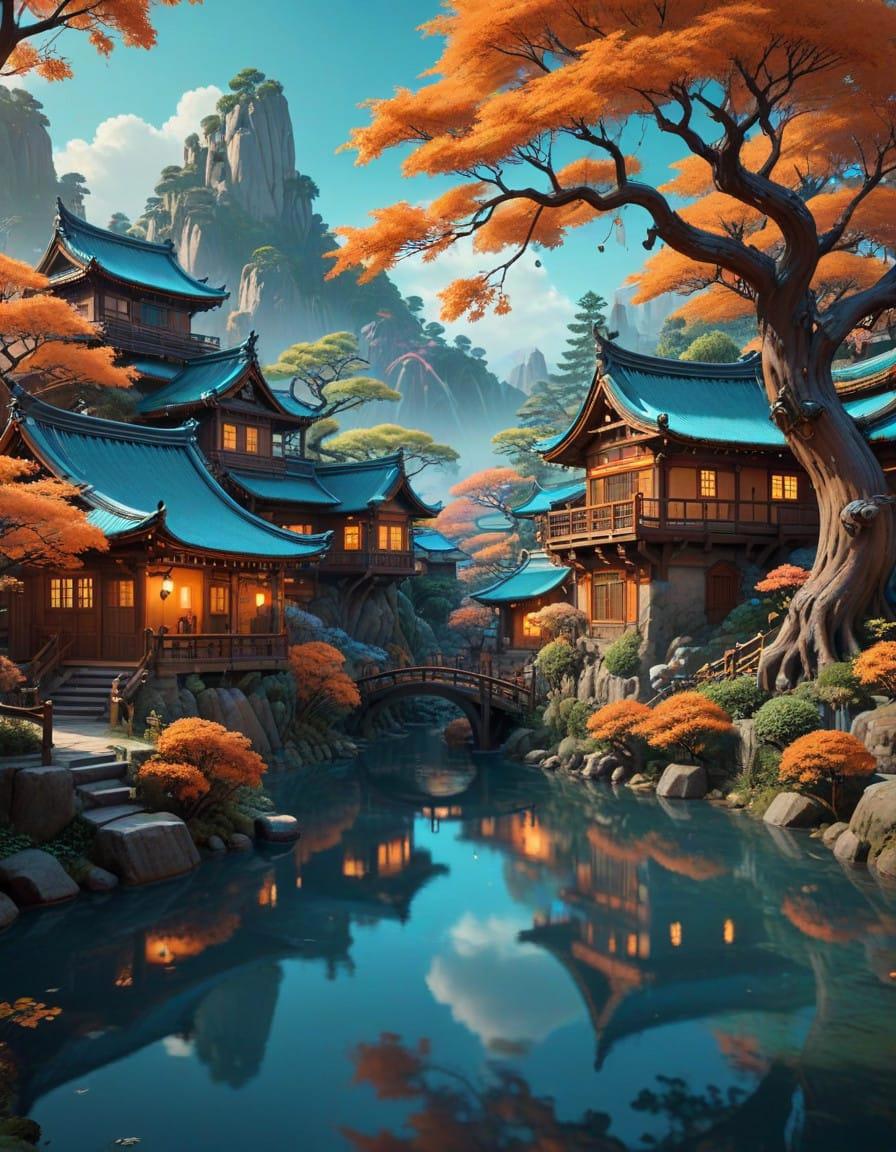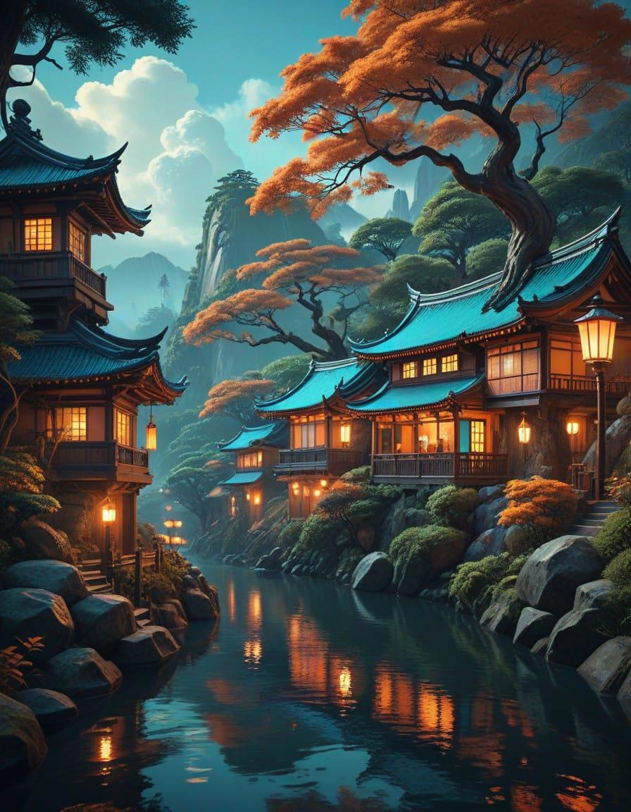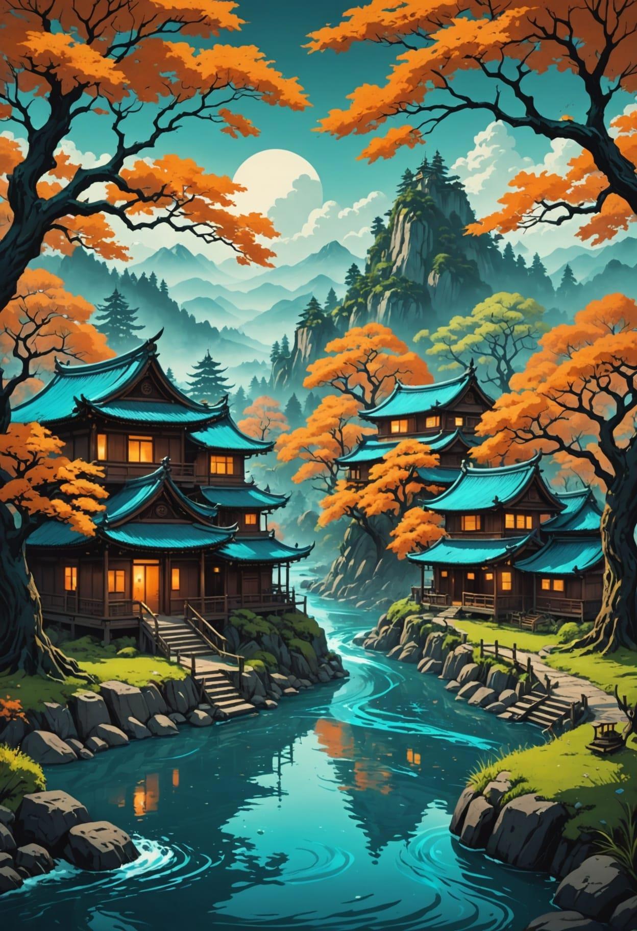 A river with trees and houses around it, in the style of unique yokai illustrations, 32k uhd, retro visuals, richly detailed gene paintings, orange and cyan, atmospheric ambiance, directional