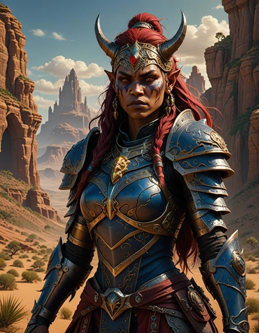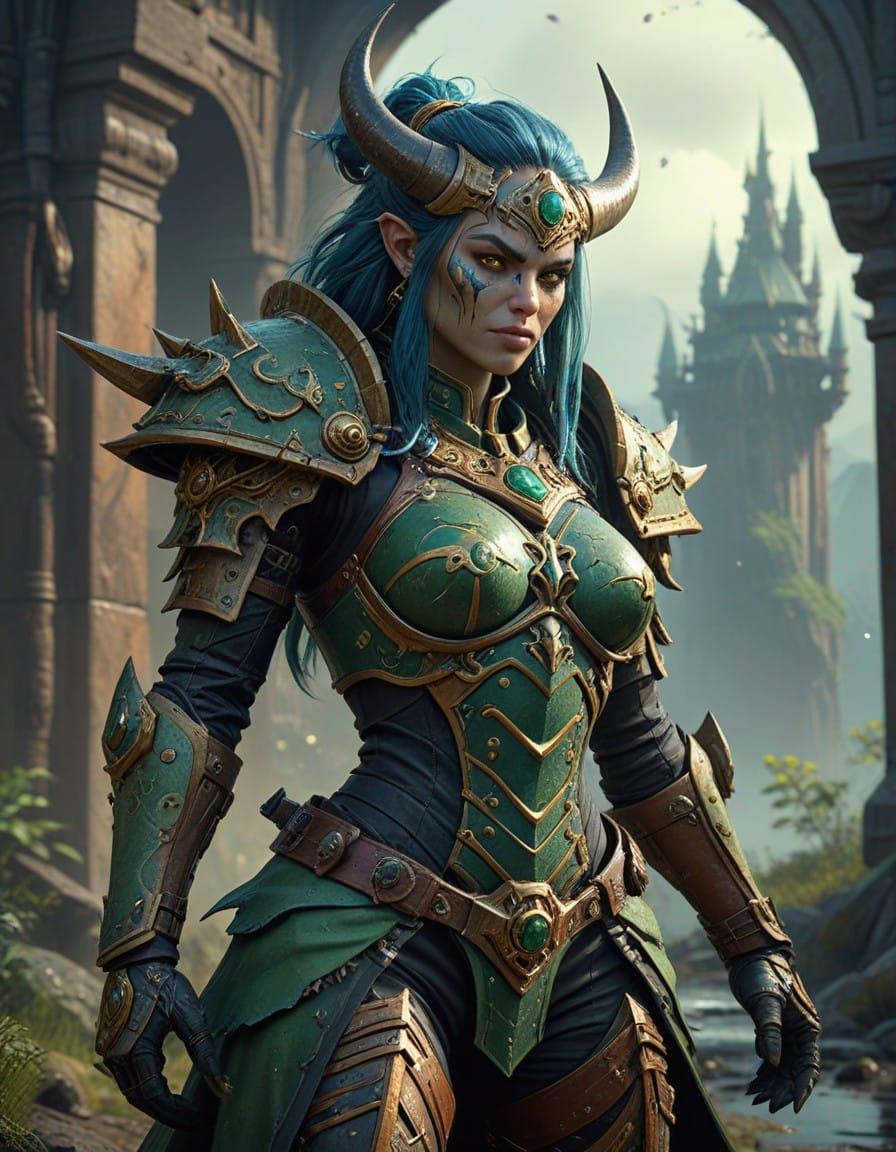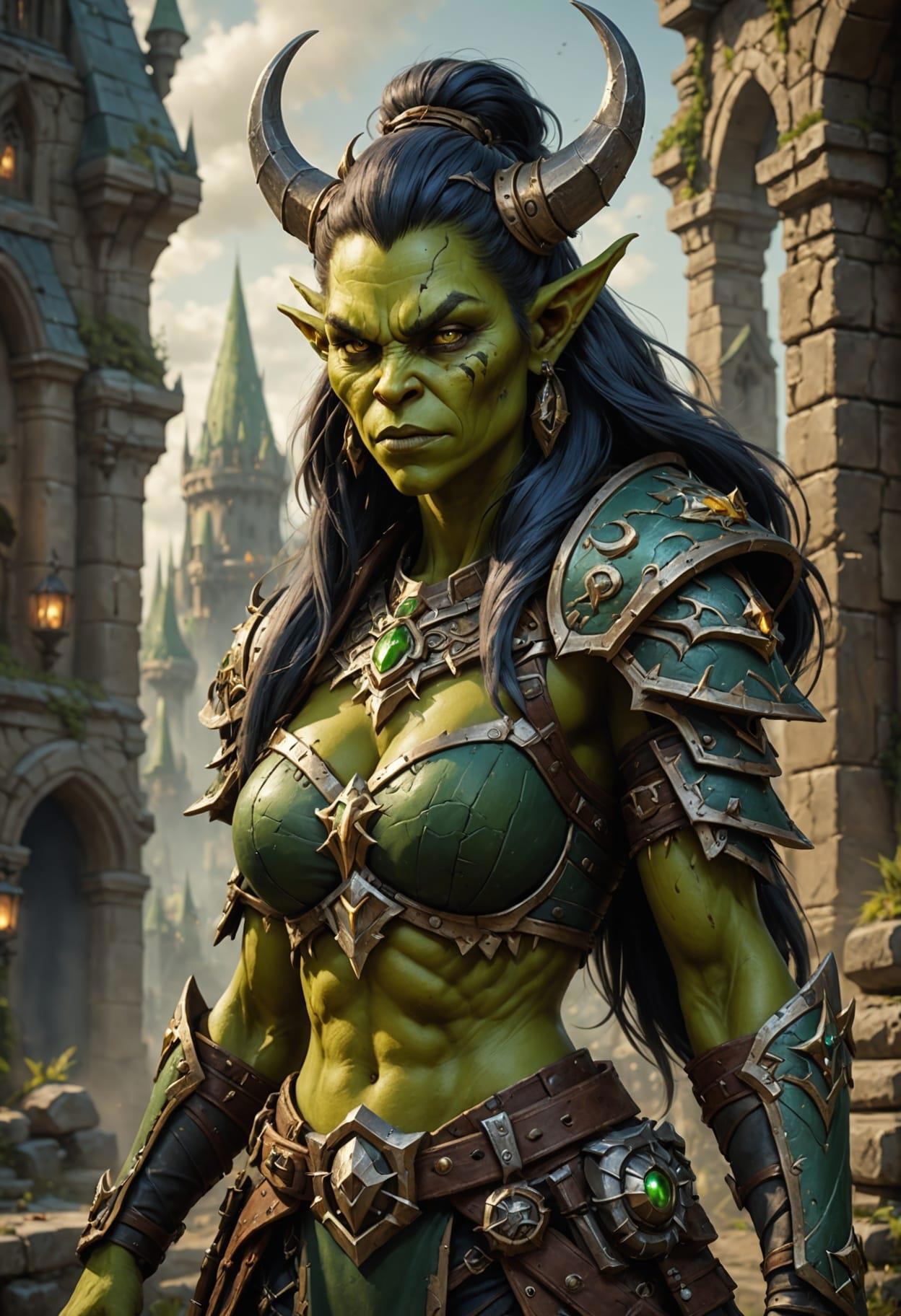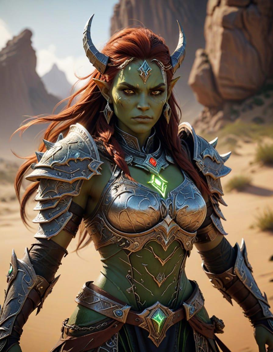 Fantasy ork Lady, beautiful, David Finch, half body, League of Legends, Dota, World of Warcraft, Lord of rings, green and sand tones