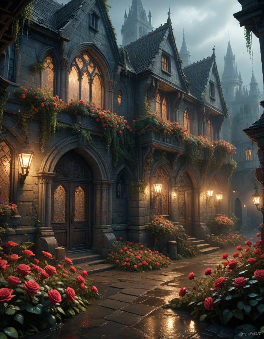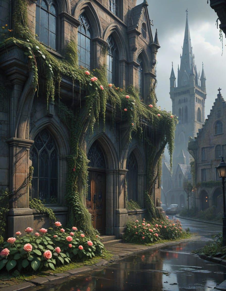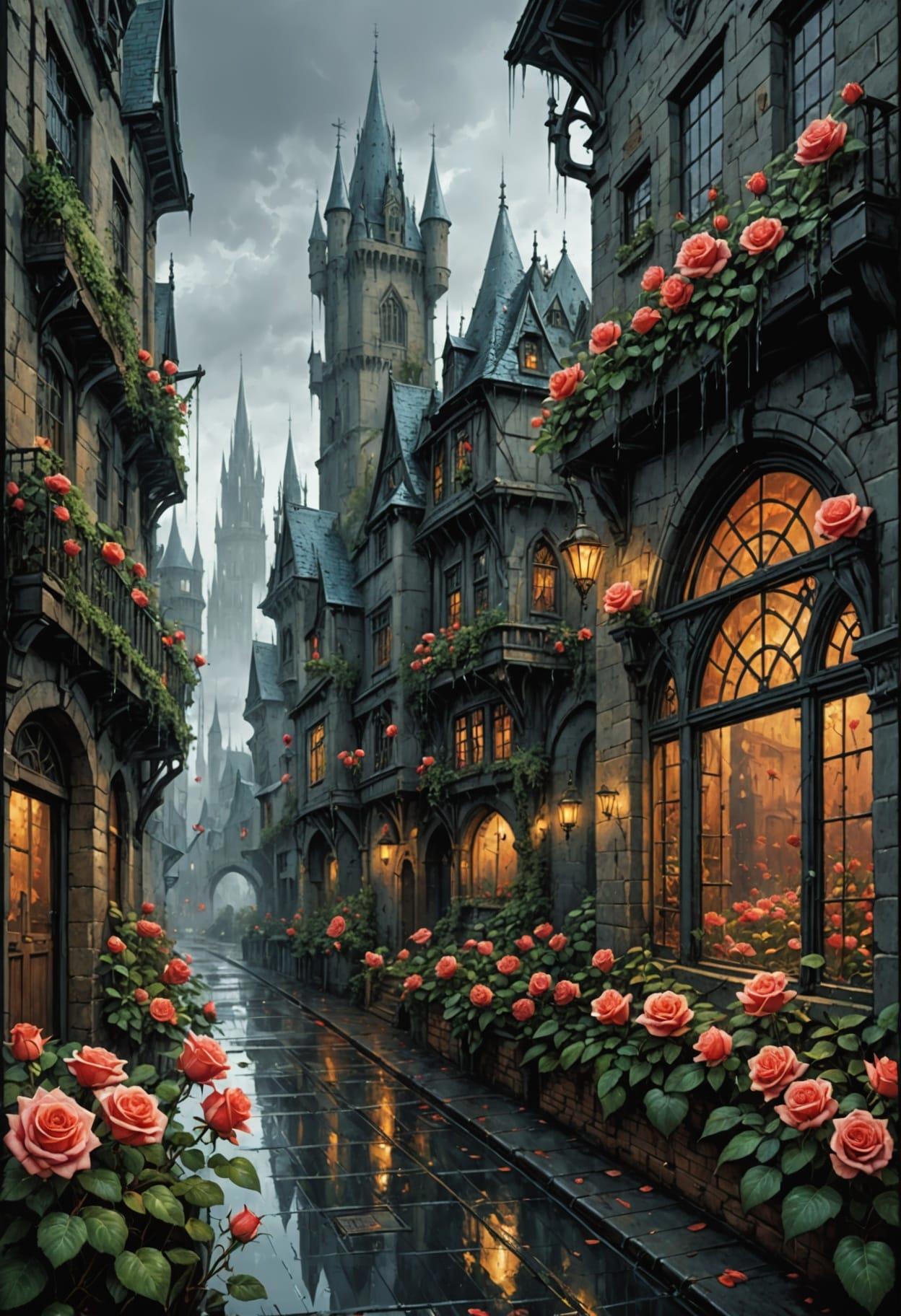 Roses and a medieval fantasy city, a downpour, a sad gray magic city, a downpour, thickets of roses everywhere. Roses wrap around, make their way on wet asphalt, hang from windows, Rodney Matthews style, ink and watercolor drawing, careless pen drawing by hand, bizarre details
