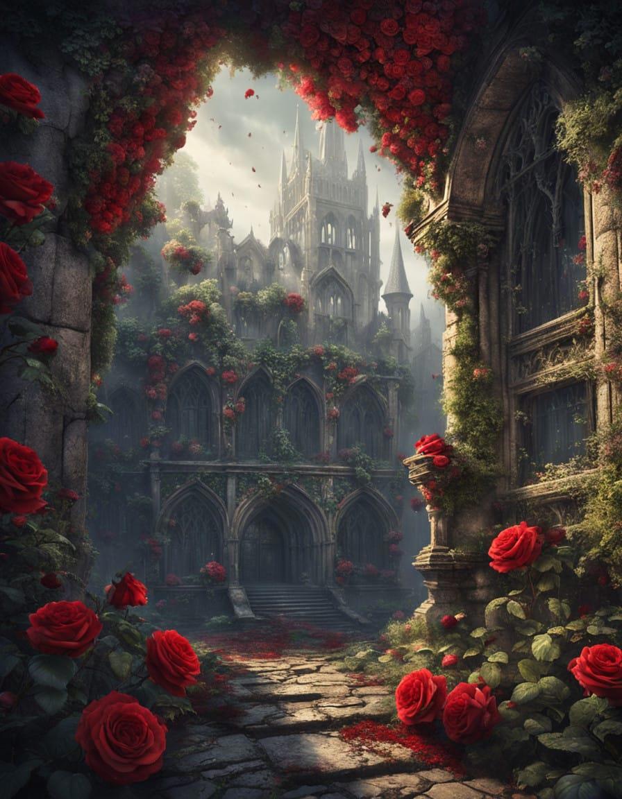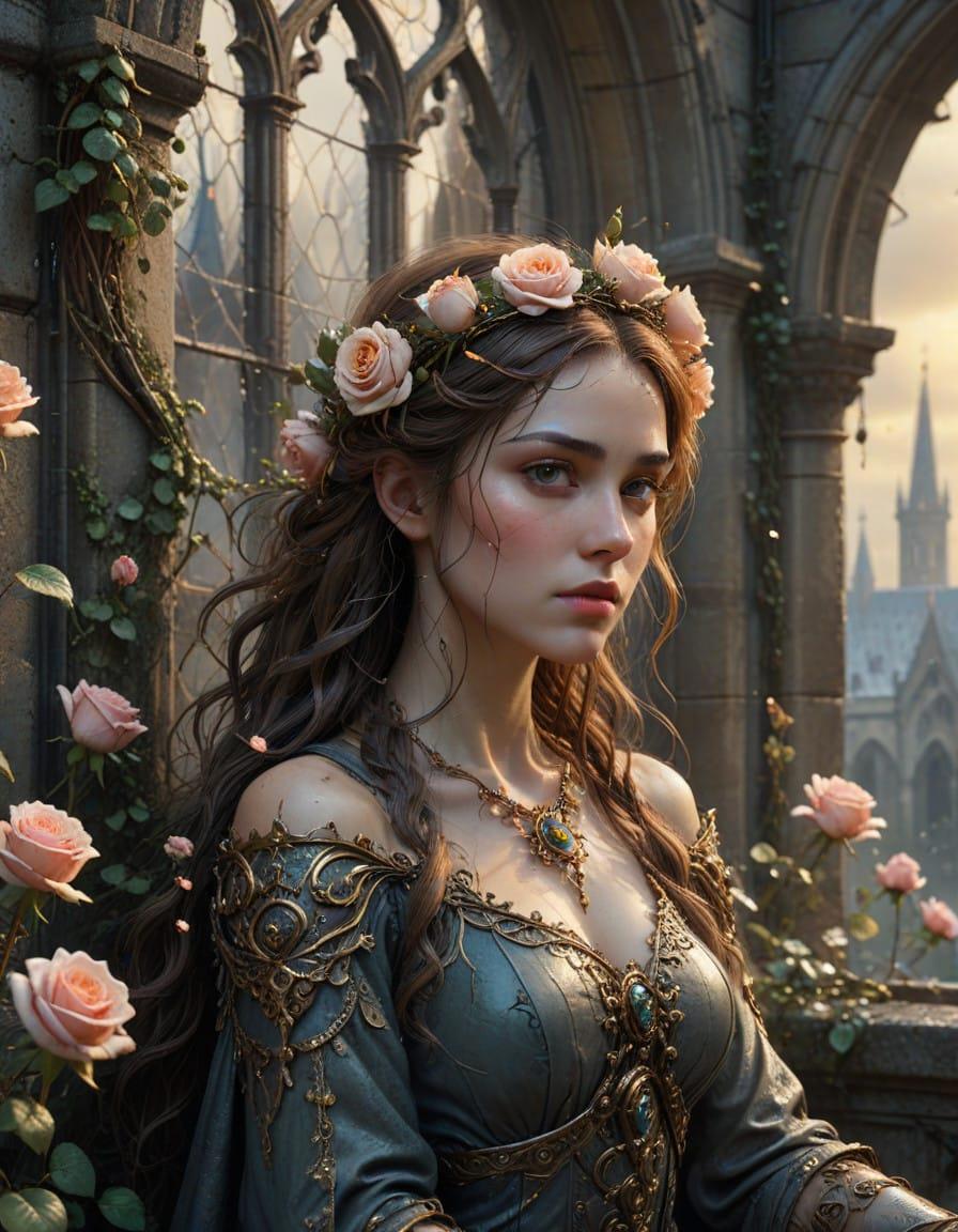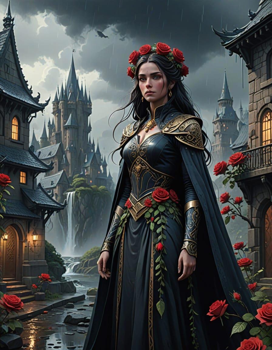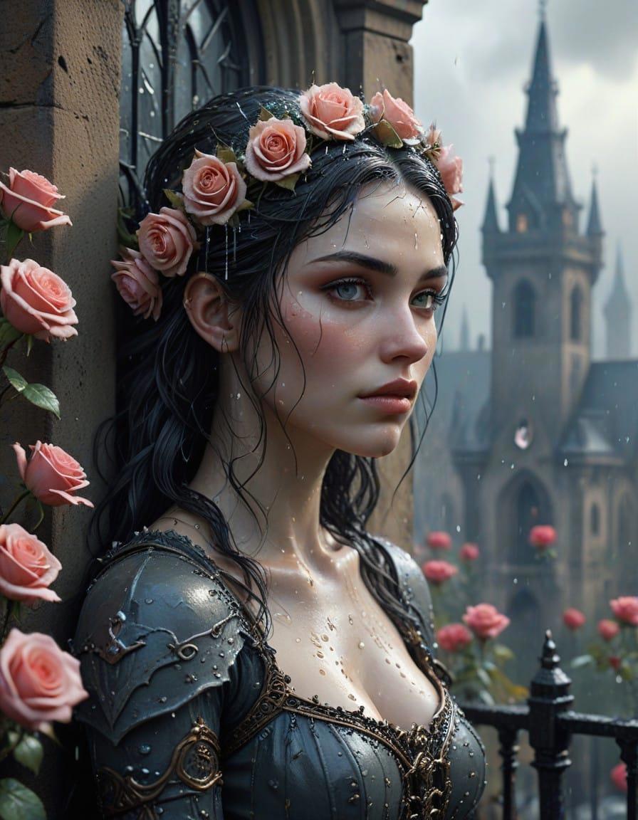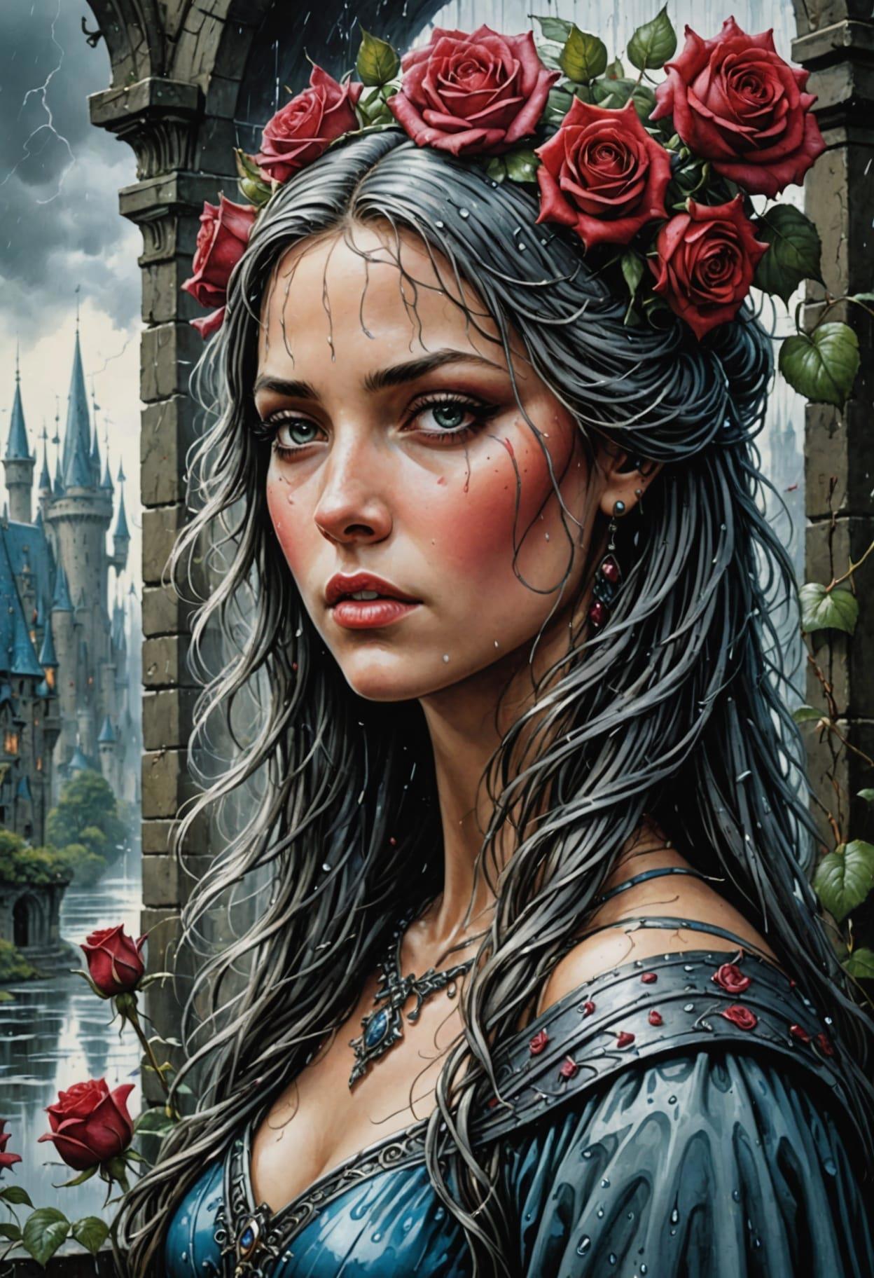 Beautiful princess portrait, close-up, looking at you, beautiful goddess face, Roses and a medieval fantasy city, a downpour, a sad gray magic city, a downpour, thickets of roses everywhere. Roses wrap around, make their way on wet asphalt, hang from windows, Rodney Matthews style, ink and watercolor drawing, careless pen drawing by hand, bizarre details