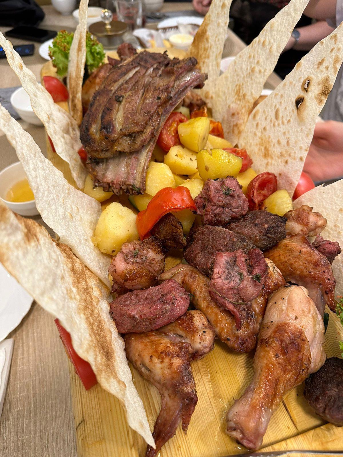После прогулки на водопад, добравшись до Каракола мы уже изрядно оголодали, поэтому заказали большое ассорти шашлыков. Ибо после прогулок по горам мясо и овощи – самый что ни на есть ЗОЖ. Оказалось, что такое количество мяса подают торжественно, красиво и с песнями.