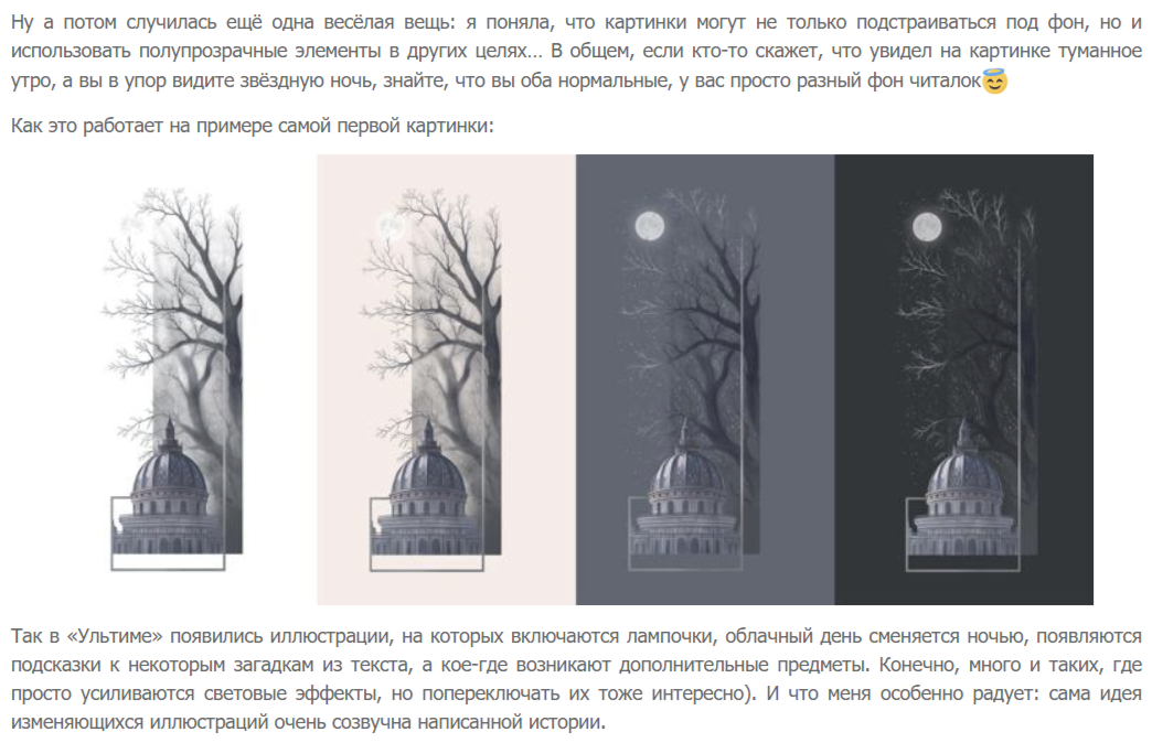 Затем была ее история про Ультиму, сама по себе история хороша и вошла в шорт-лист конкурса "Настоящий детектив" и сейчас носит звездочку "Рекомендовано АТ". Но для меня "Ультима" - это совершенно особая книга на АТ безо всяких звездочек благодаря гениальной идее, как Юлия придумала проиллюстрировать ее. Здесь она рассказала об этой идее.