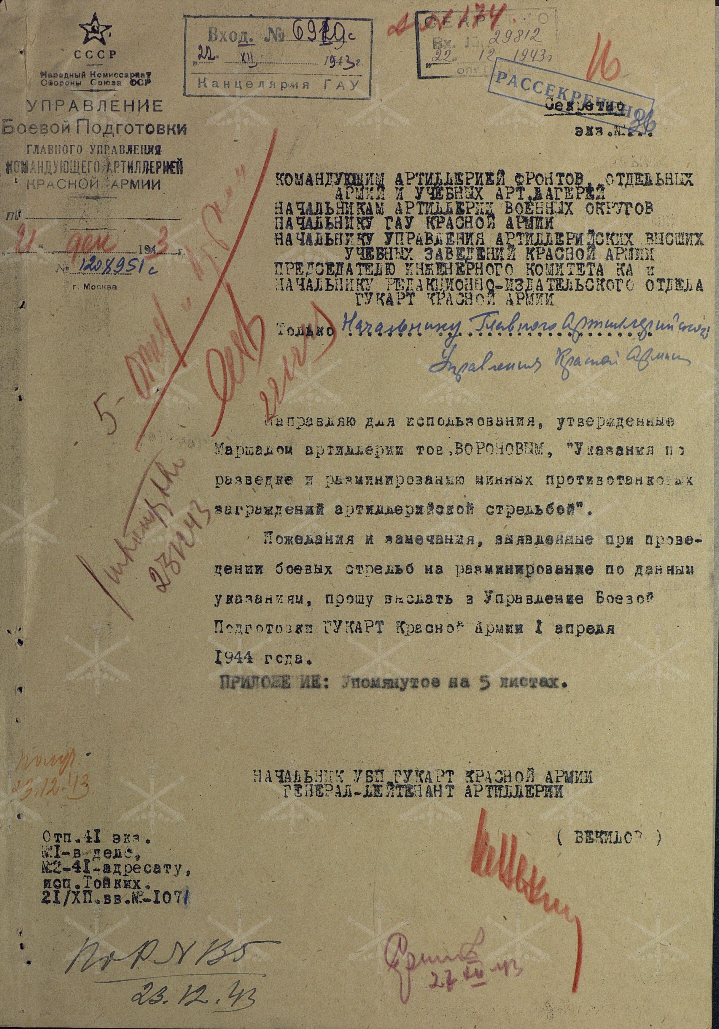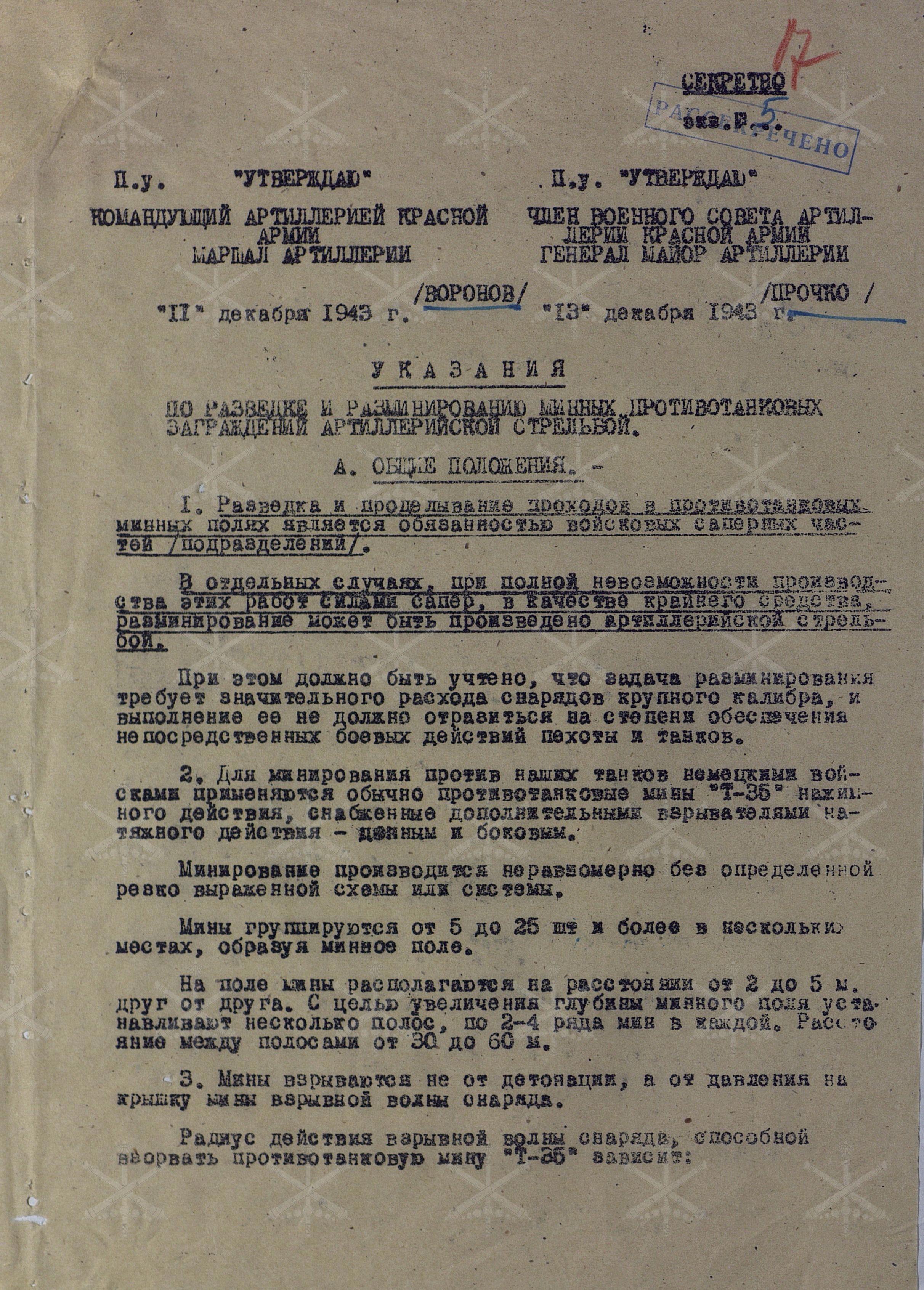 Итак, сегодняшний разговор будет посвящён указаниям, утвержденным маршалом артиллерии Н. Н. Вороновым 21 декабря 1943 г., которые так и называются «Указание по разведке и разминирование противотанковых заграждений артиллерийской стрельбой».