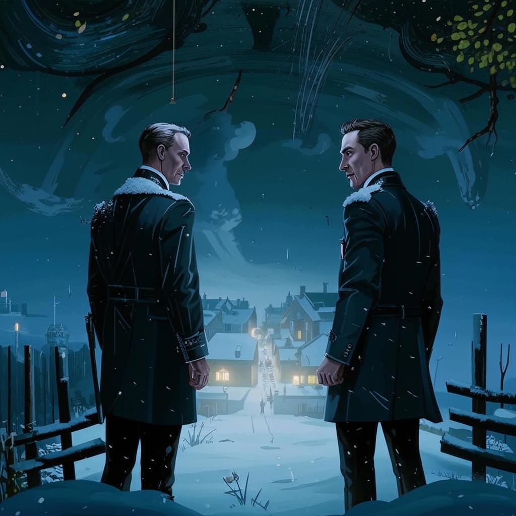 ...Они стояли друг напротив друга. Два Великих мага. Оба в черных пальто, с зачесанными назад темными коротким волосами. В дорогих кожаных туфлях, ушедших в землю по края брюк. Такие похожие и разные одновременно. То ли из-за непогоды, то ли из-за слез, вставших в глазах, мне показалось, я вижу одного человека, смотрящегося в большое зеркало и желающего убить другого себя.
