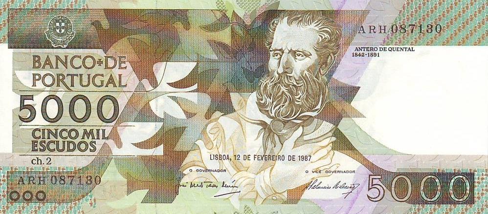 Как и его коллега по старой купюре в 1000 эскудо Квентал был литератором и республиканцем, воспитанным в аристократической семье.