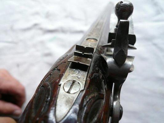 Пример пистолетв мастерской Кюхенройтера, перекидной целик на дистанции 25, 50 и 75 (чего - доподлинно не известно, скорее всего шаги).