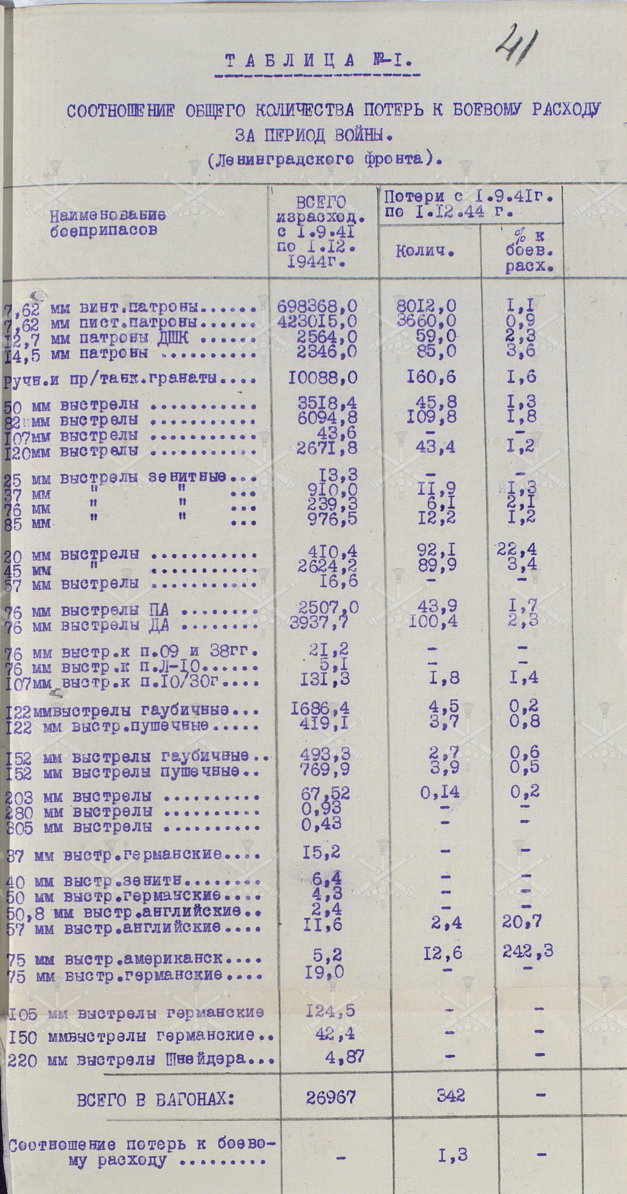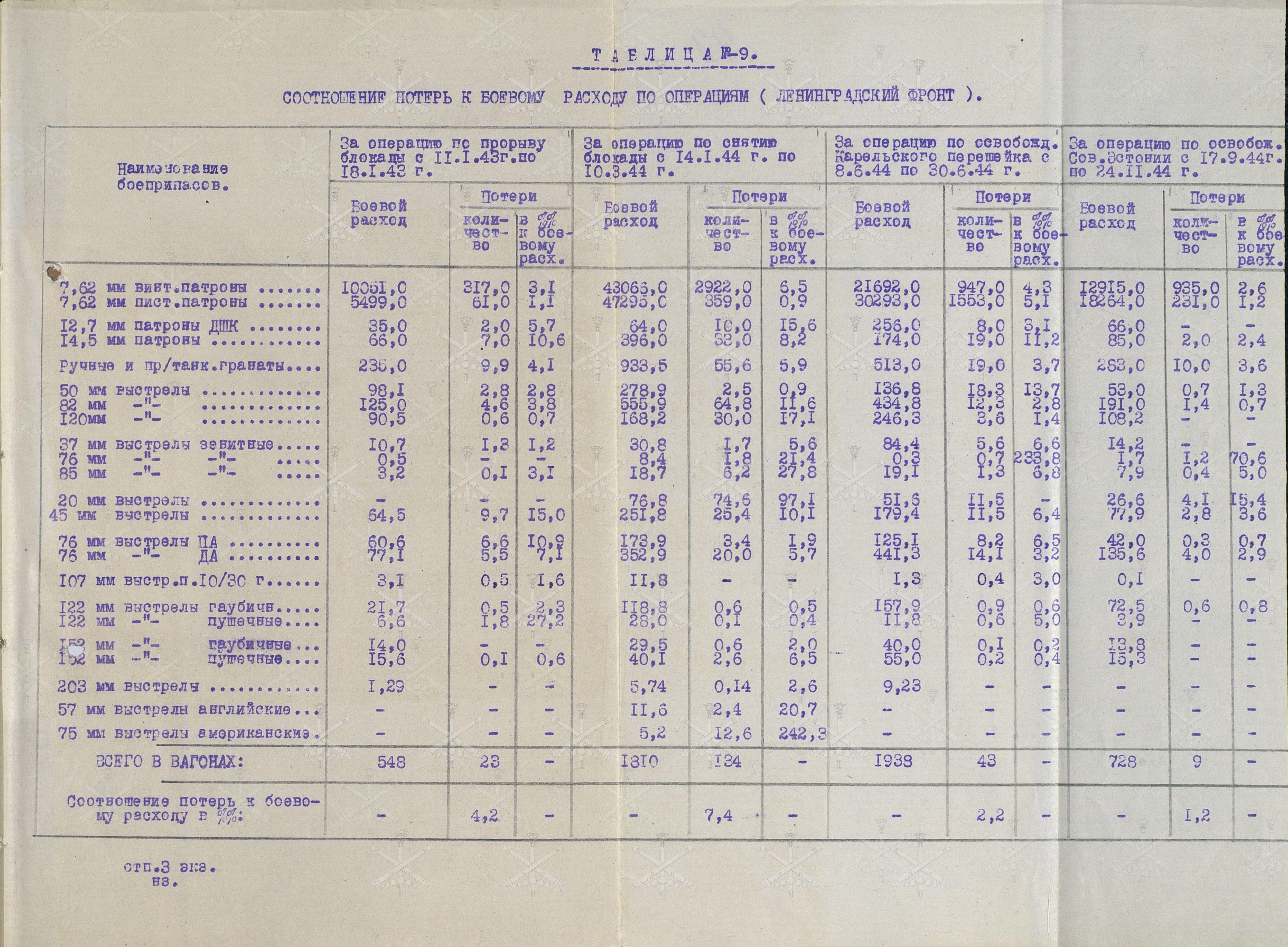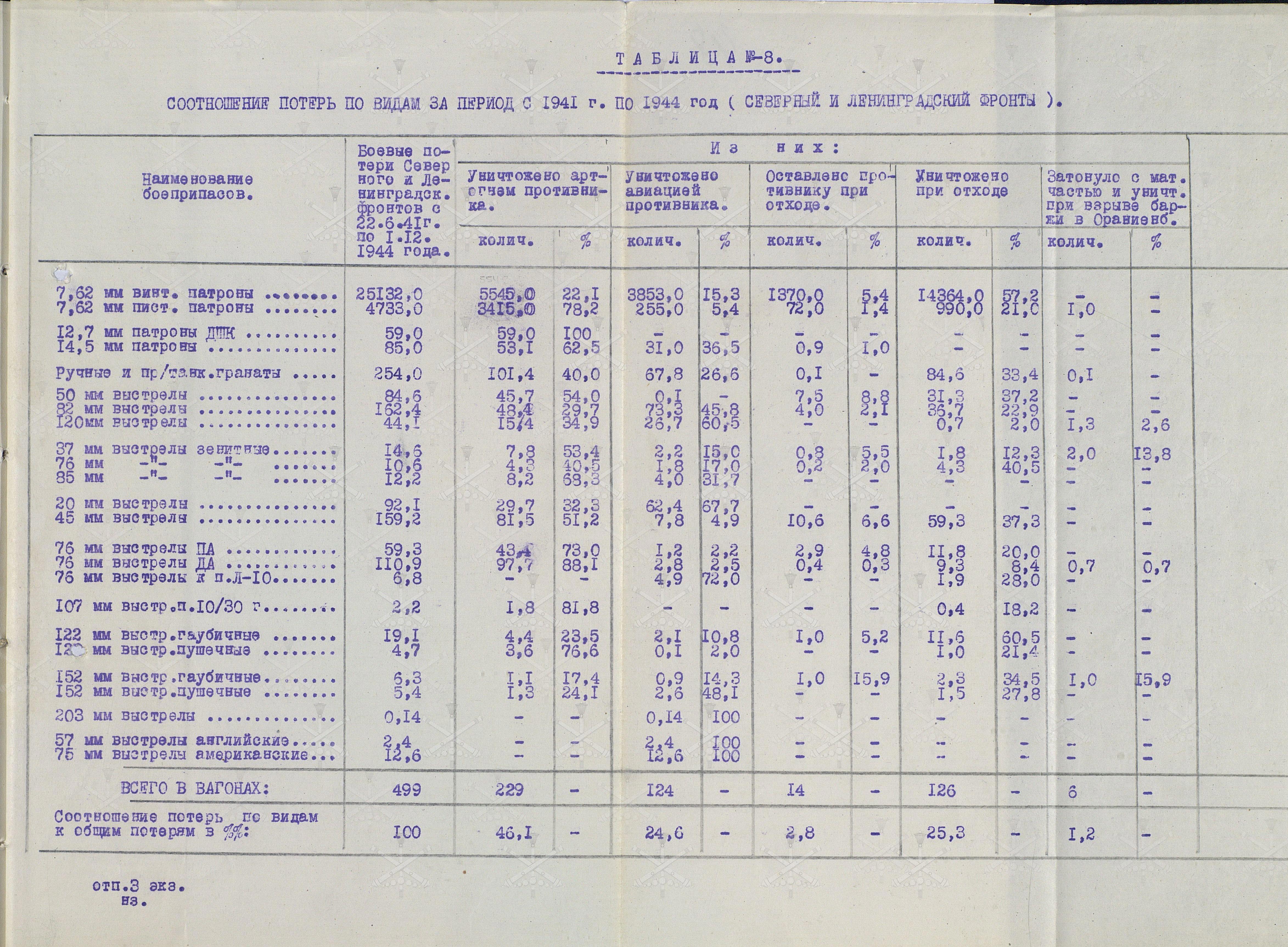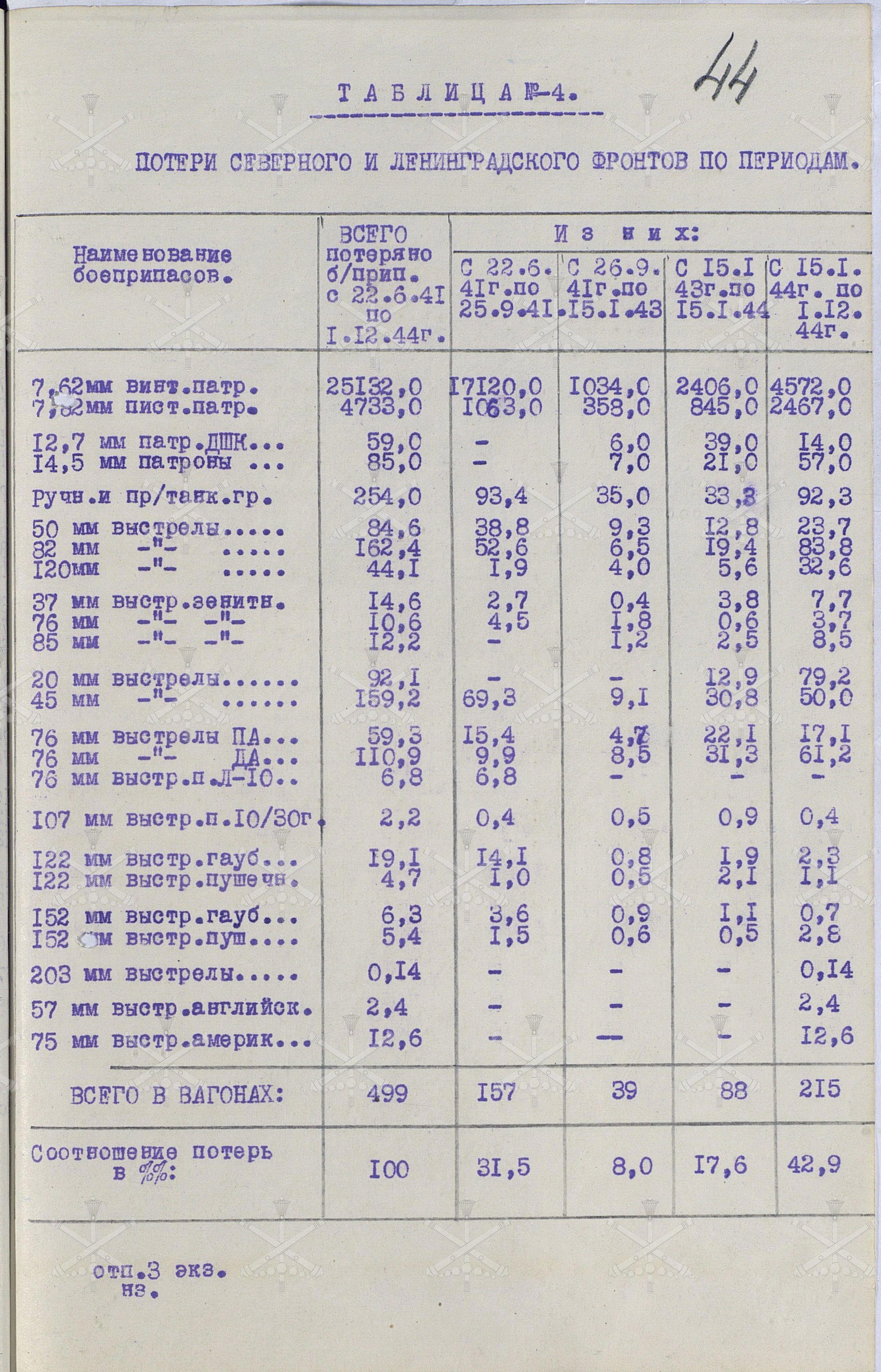 Потери боеприпасов Ленинградским и Северным фронтами в Отечественной войне 1941-1944 г.г.
