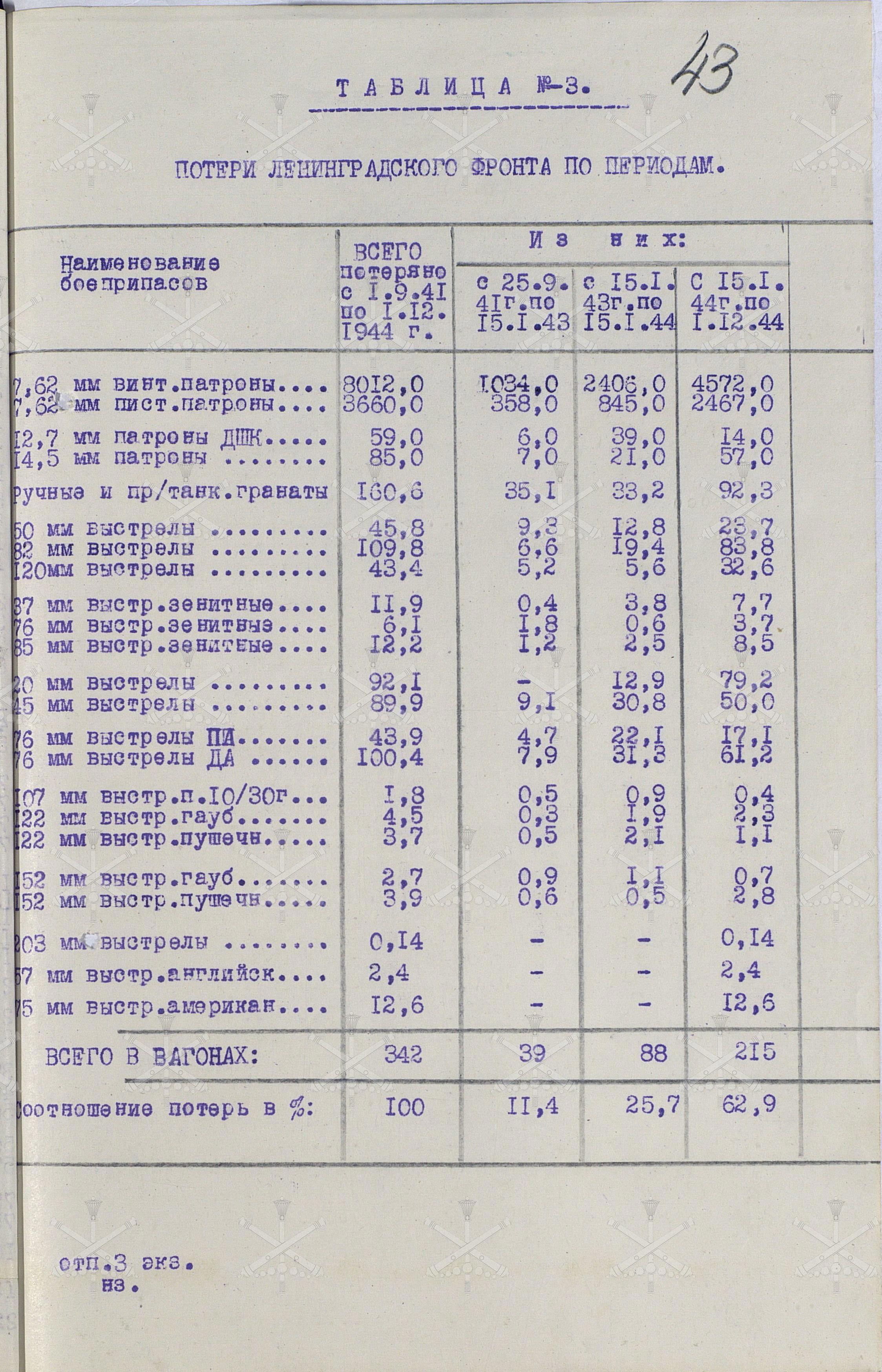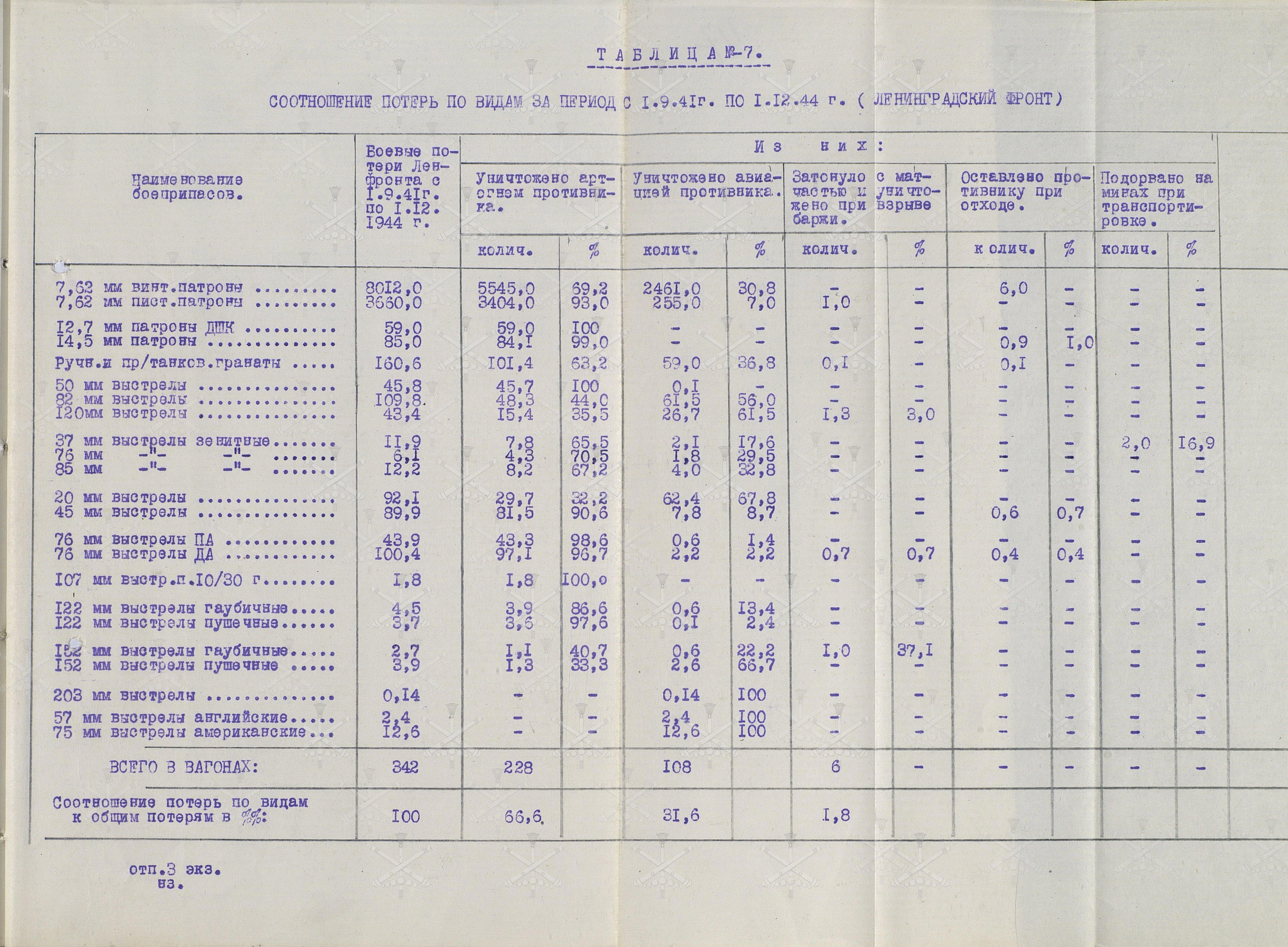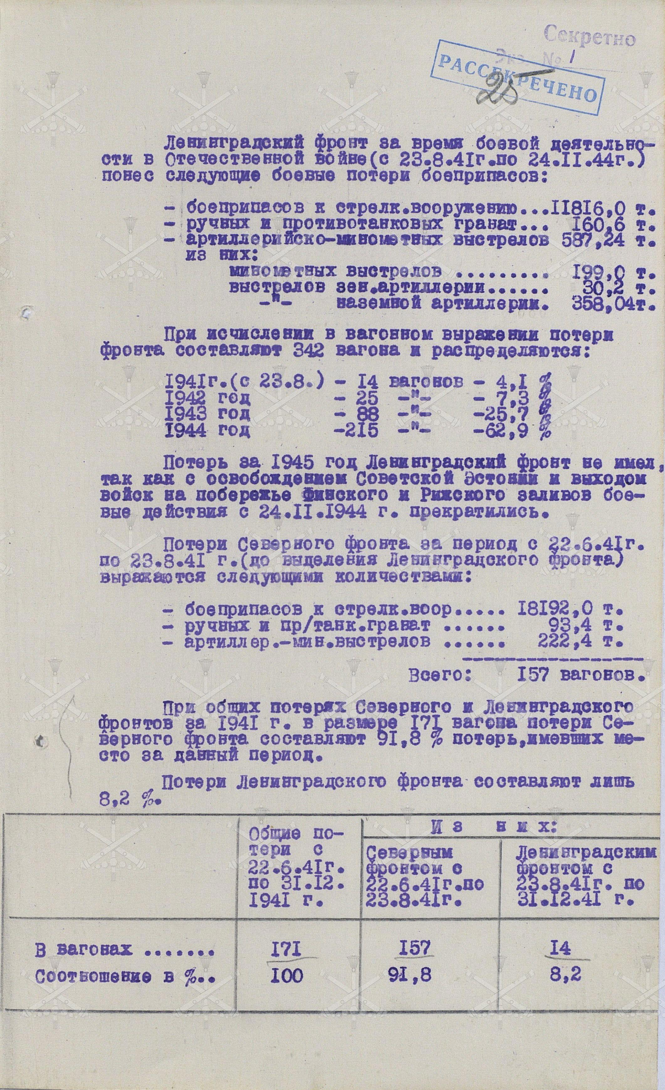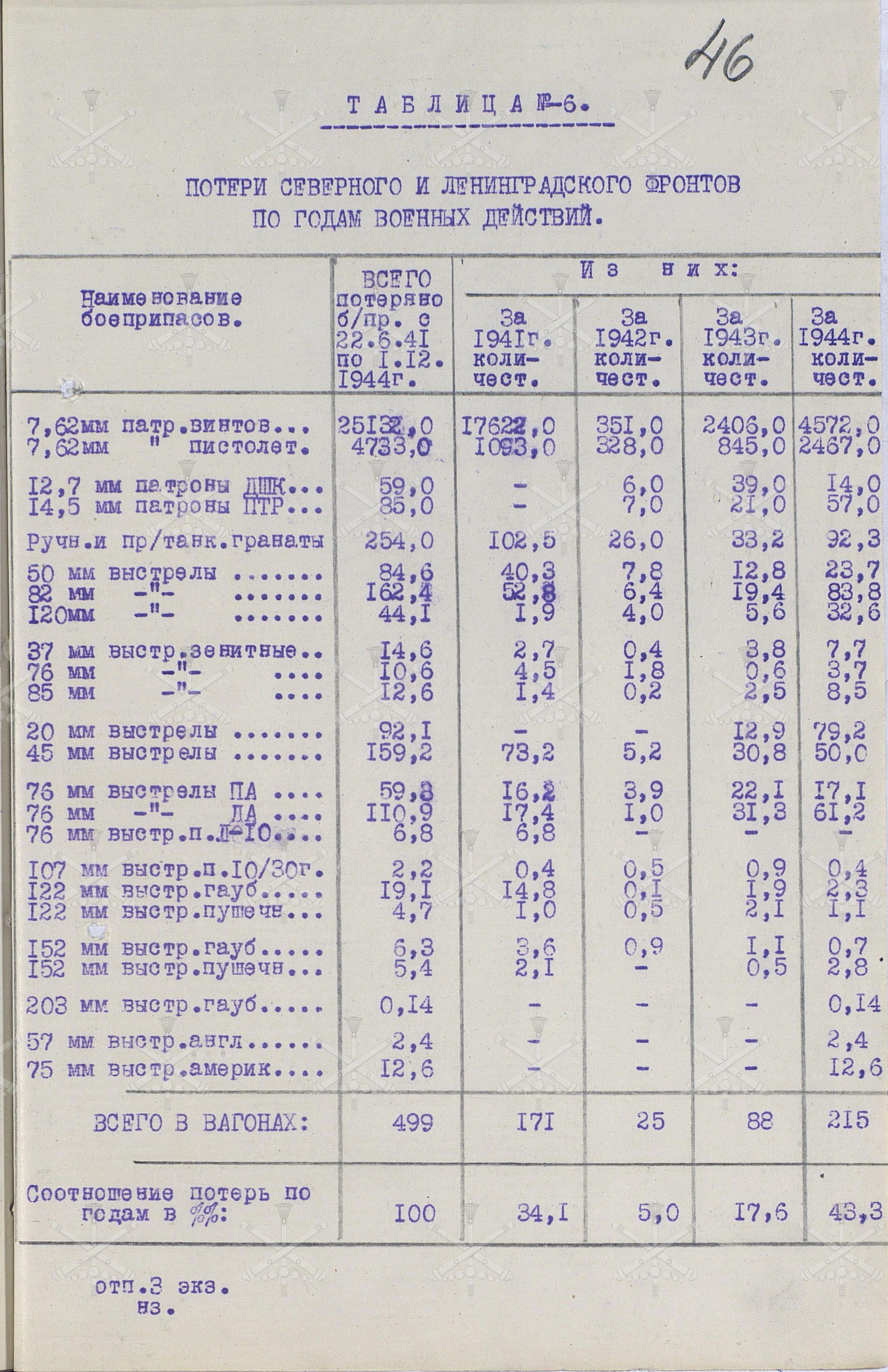 Потери боеприпасов Ленинградским и Северным фронтами в Отечественной войне 1941-1944 г.г.