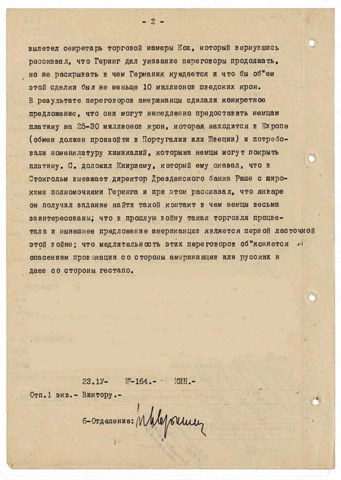Американцы нуждаются в определённых немецких химикалиях и согласны продать немцам платину и технические алмазы, причём дальнейшая детализация сделки произойдёт после принципиального согласия немцев.