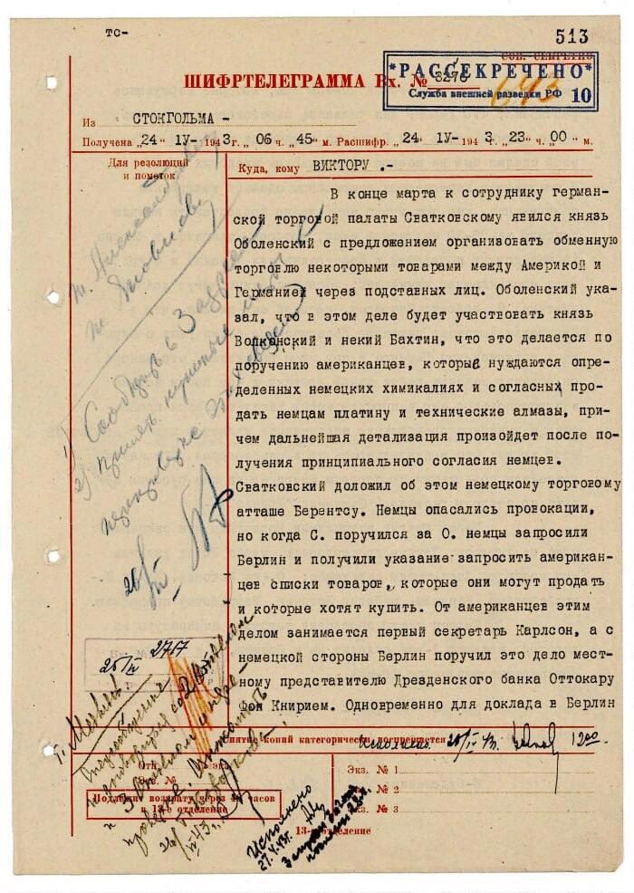 Дата 24 апреля 1943 г. (То есть торговля шла, отслеживалась, ибо сообщение - не молния, а очередное агентурное).