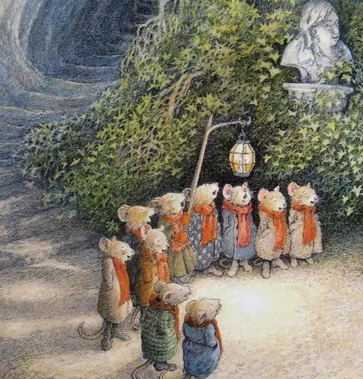 Когда друзья распахнули дверь, их глазам предстало красивое зрелище. На переднем дворе, освещенном тусклыми лучами фонаря, стояли полукругом восемь или десять маленьких полевых мышат: обмотав шеи красными шерстяными шарфами, они засунули передние лапки глубоко в карманы и притоптывали задними лапками, чтобы согреться. Блестящими глазами-бусинками мышата застенчиво поглядывали друг на друга, слегка хихикали, шмыгали носами и часто вытирали их рукавами пальто. Когда дверь открылась, один из старших (он держал фонарь), сказал: