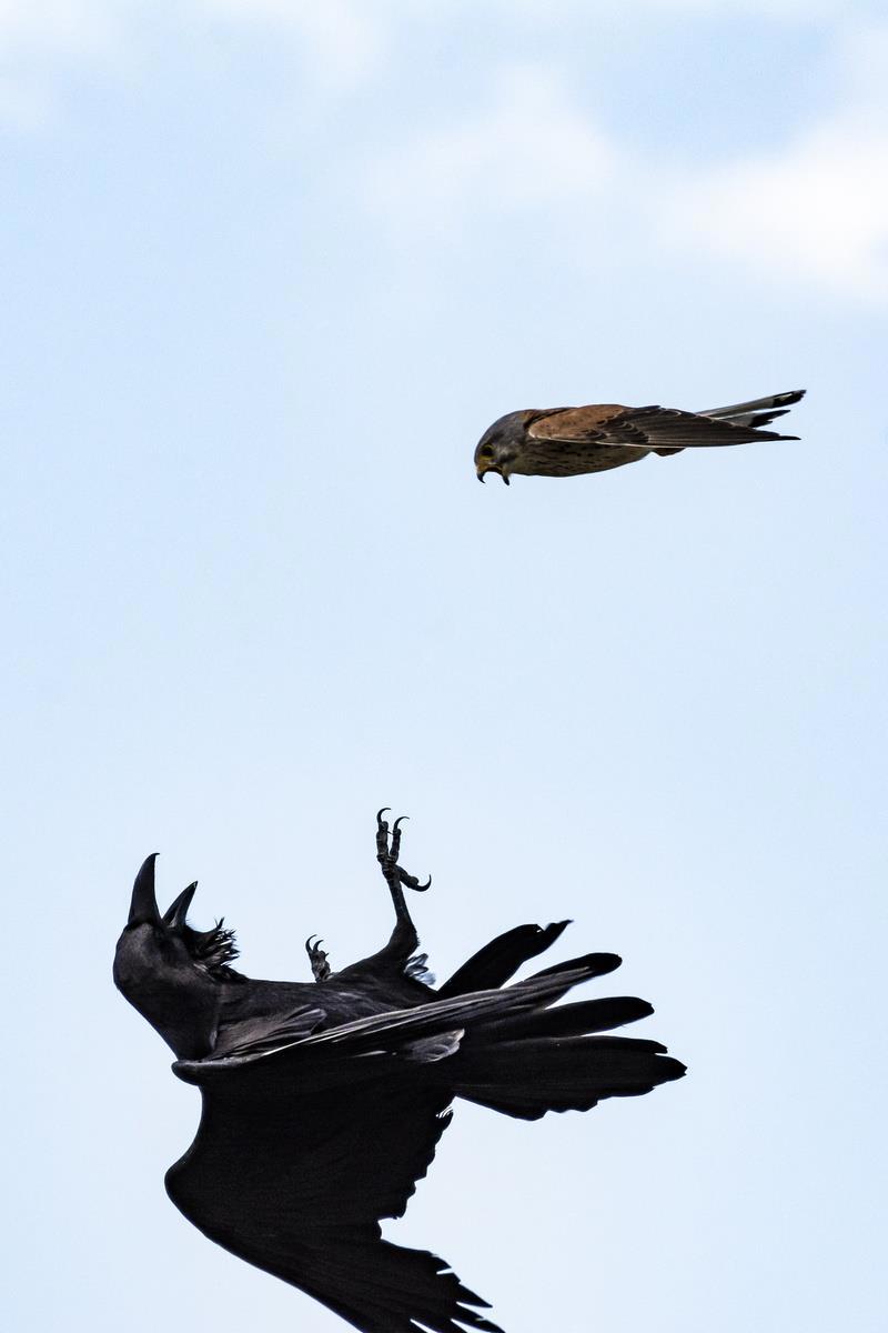 Сокол гонит ворона от гнезда. Фото Сергея Малышева.