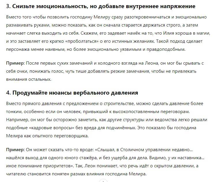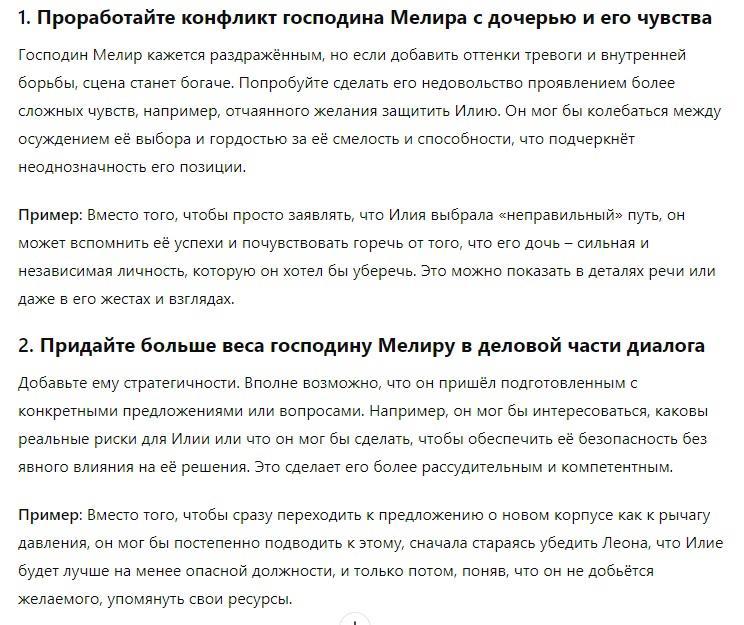 7. Для ускорения работы над текстом я активно юзала ChatGPT. Я заливала в него куски текста с просьбой раскритиковать и найти слабые места. Это позволяло мне проработать первую редакцию без привлечения консультантов, и с ними обсуждать уже более или менее твердый текст и глубокие проблемы. Вот, например, советы чата по поводу сцены, в которой отец Илии приходит ругаться на ее откаты: