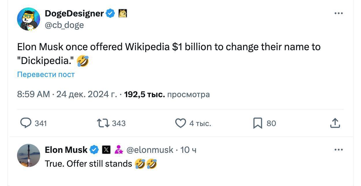 Он предлагает один миллиард долларов за изменение названия информационного сайта Википедия на Членопедия! Если мой пост поможет заработать вам этот миллиард, то я хочу 5% за благую весть! Жду свои скромные 50 миллионов с большим нетерпением!