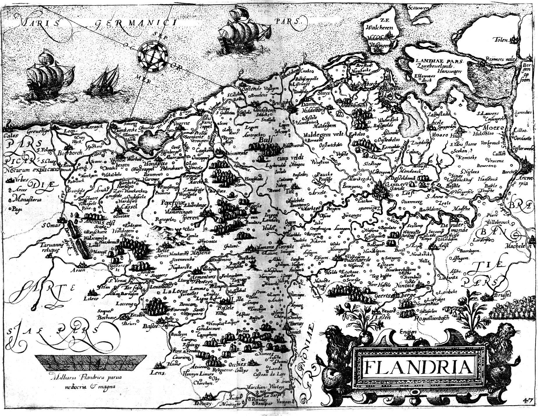 А теперь подробности. Одна из 17 провинций — Фландрия. Именно тут располагаются Гент (где живет Александр де Бретей), Брюгге и Антверпен. И, кстати, Фландрия граничит с французской провинцией Пикардией, где располагается фамильный замок Александра де Бретея — Бретей. Пикардия на карте краешком видна.