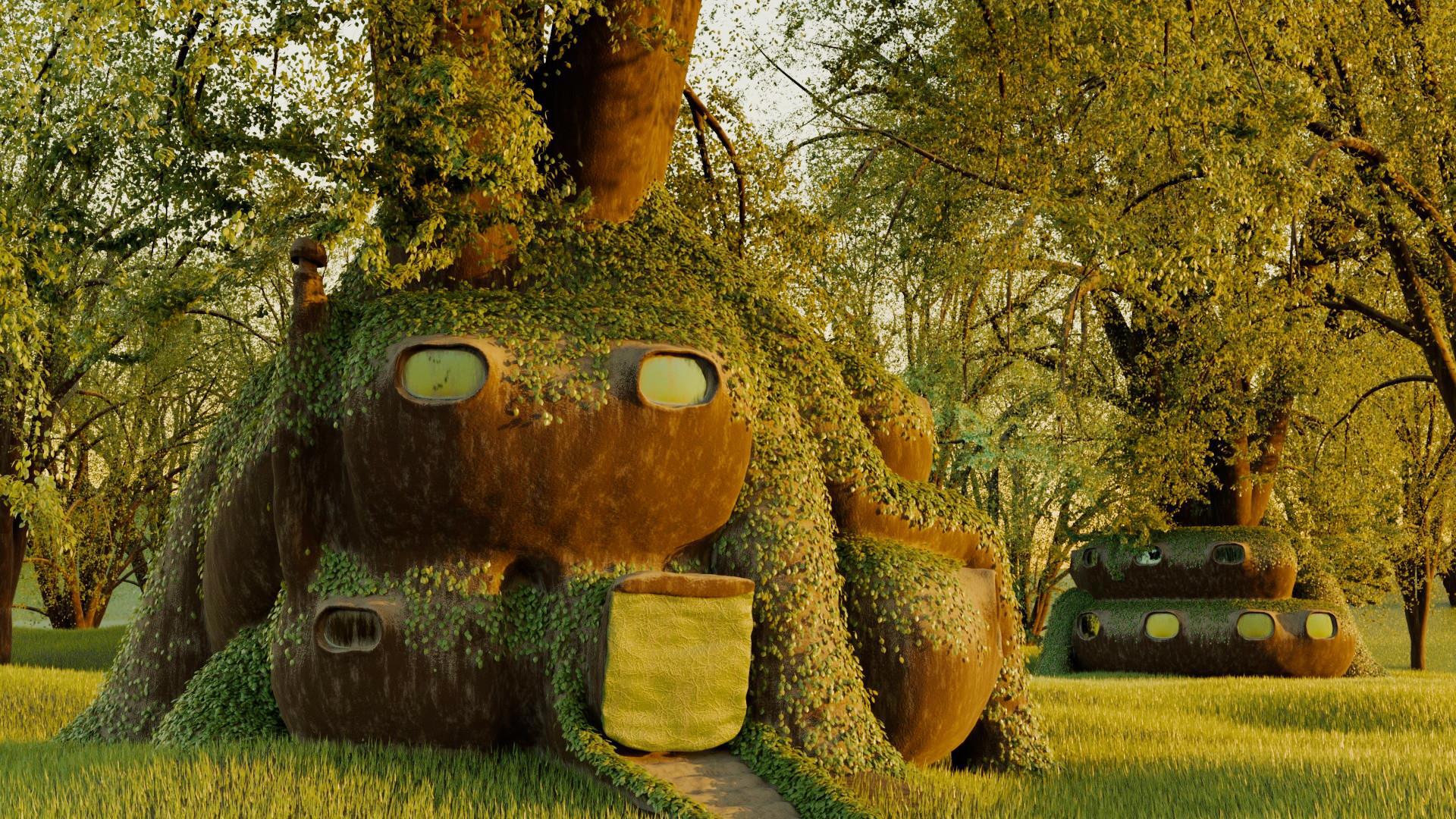 Весь дом это часть дерева, включая окна. Дверь - это рулонная занавесь, которая сворачивается по телепатической команде, от владельца. Впрочем, по задумке её можно поддеть лапой или носом. Всё верно в этом живут с виду обычные четвероногие волки. Получается нечто вроде магов природы (эльфов) в шкуре животных, и в современности. Потому домик выглядит и как некая научная станция или база из фантастического фильма, но из других материалов.