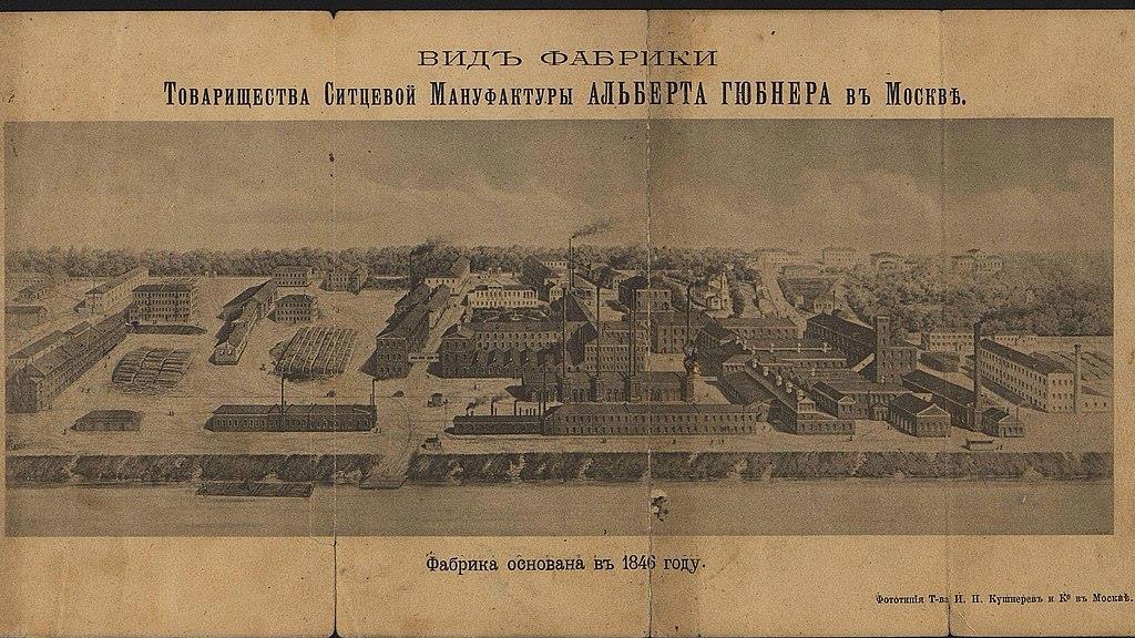 Гюбнеровская мануфактура - впоследствии комбинат им.Свердлова, АООТ "Московский шелк", ныне "деловой квартал" в Хамовниках, между Савинской набережной, Большим и Малым Савинскими переулками. Вот ее вид в конце XIX века: