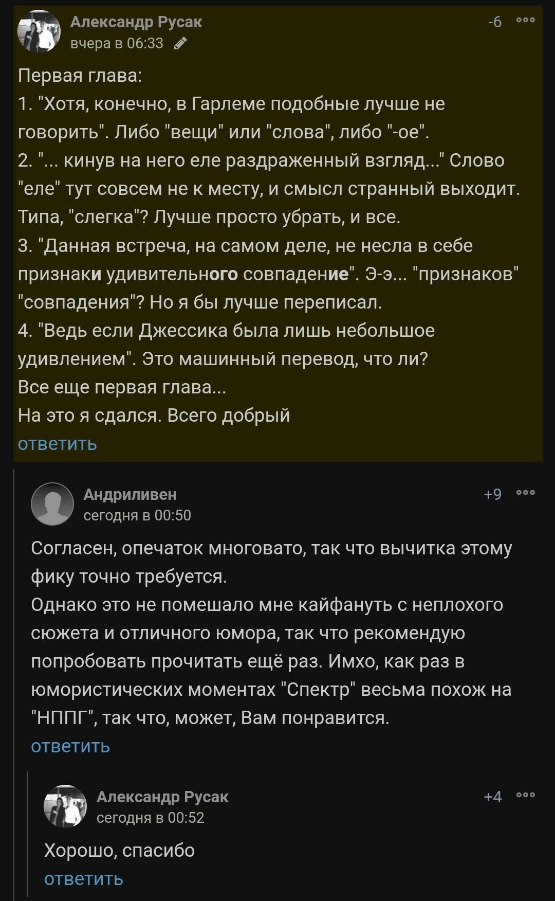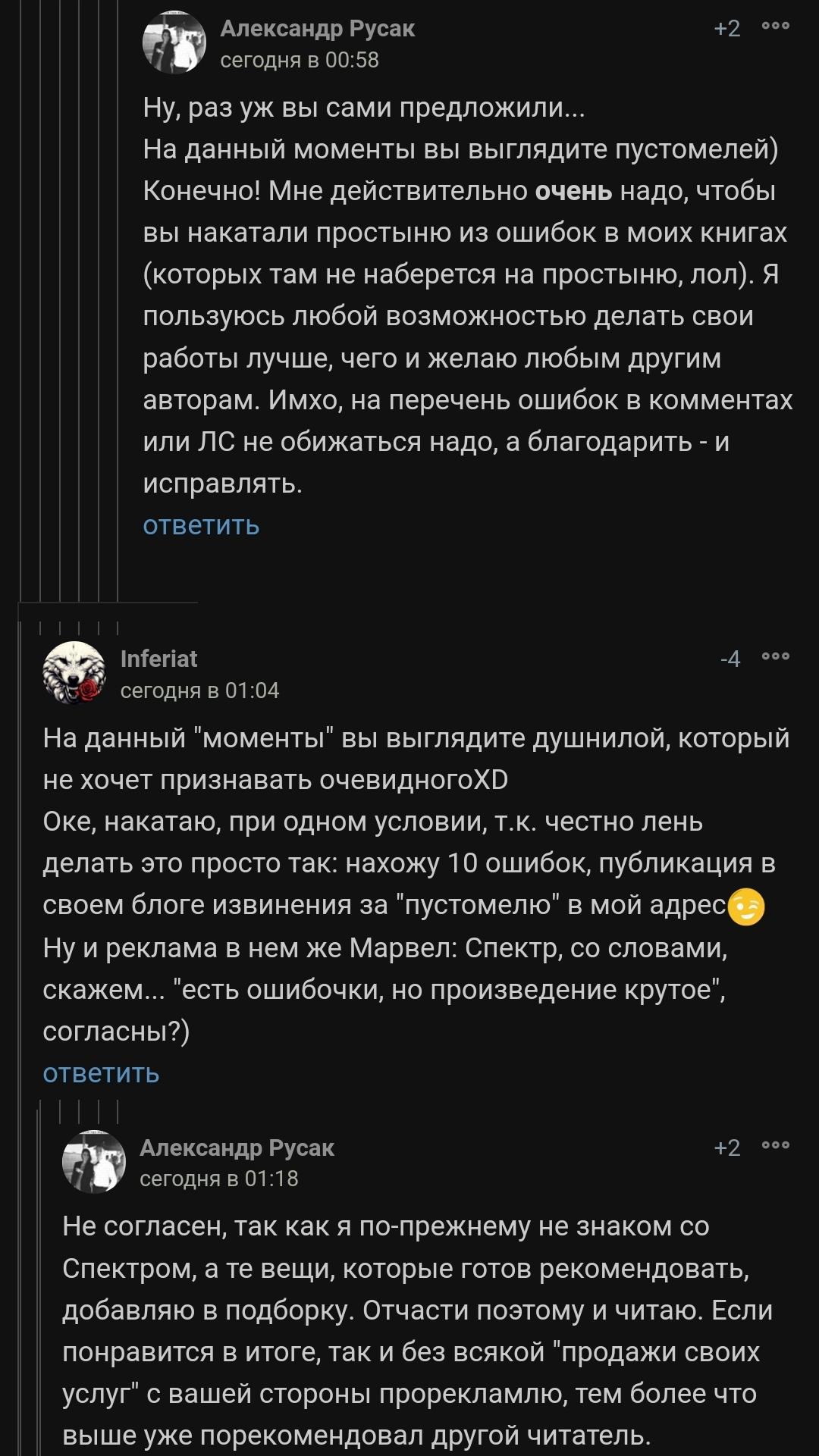 2.2. Заказчик обязуется в течение одного (1) дня с момента получения перечня ошибок и опечаток в одном (1) или более Произведении в размере десяти (10) или более пунктов опубликовать в своем блоге [по адресу: https://author.today/u/xan3on/posts ], в том же посте, рекламу стороннего произведения «Марвел: Спектр» [по адресу: https://author.today/work/370495 ], со словами «есть ошибочки, но произведение крутое».