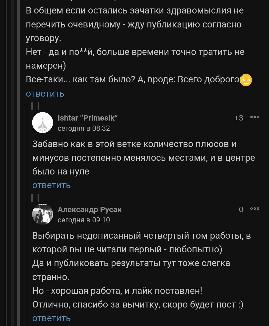 3.3. Данный Договор не несет в себе цели оскорбить кого бы то ни было и не нарушает никакие авторские или смежные права. Все ресурсы, все комментарии, все слова, имеющие отношение к данному Договору и/или к условиям соглашения между Сторонами, находятся в публичном доступе и могут быть найдены либо в данном посте, либо по следующему адресу: https://author.today/work/370495?c=29886832&th=29867742