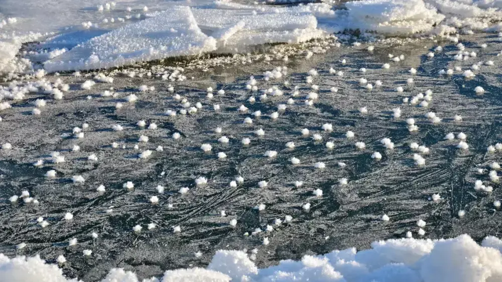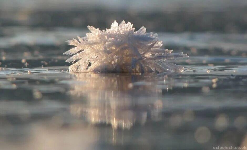 По сути этот тот же процесс, который приводит к образованию снежинок в облаках, и результат оказывается весьма схожим, но только эти снежинки не парят в воздухе, а плавают на поверхности воды.