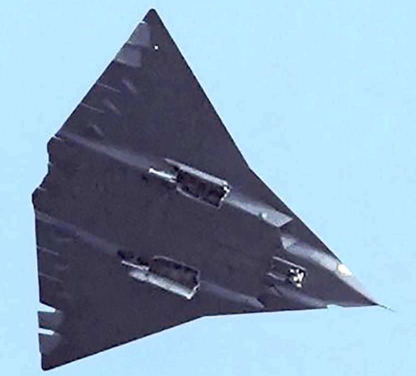 Из того, что можно разглядеть на кадрах – это два воздухозаборника снизу и ещё один сверху. Заметны также локаторы бокового обзора. Те самые, которые хотели, но не поставили из экономии сэшэашники на свой Фу-22 и на которые не пожадничали наши на Су-57. Так что можно предположить, что зона обзора на китайском самолёте не меньше, чем на Су-57. Обратили внимание на крупные размеры и мощные стойки шасси. Сделали вывод – машина очень тяжёлая и имеет большую дальность полёта. Возможно, что и оружейный отсек у машины не маленький. Это, собственно, и всё. Но даже такой куцый список как-то подозрительно напоминает ныне покойную сэшэашную программу NCAD первого разлива.