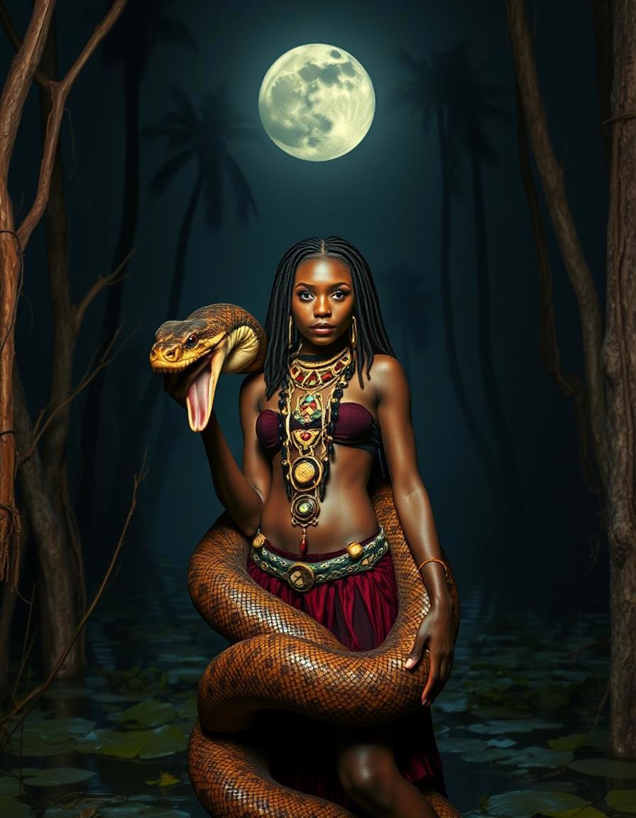 В еще одном рассказе с говорящим названием «Болото вуду» черная колдунья называет себя жрицей Великой Змеи. Впрочем, Князь Тьмы в говардовской интерпретации африканских верований может принимать и иные формы: так в рассказе «Красные тени» из серии про Соломона Кейна, колдун Н’лонга, союзник пуританина, почитает звероподобного Черного Бога, которого Говард именует «душой Африки».
