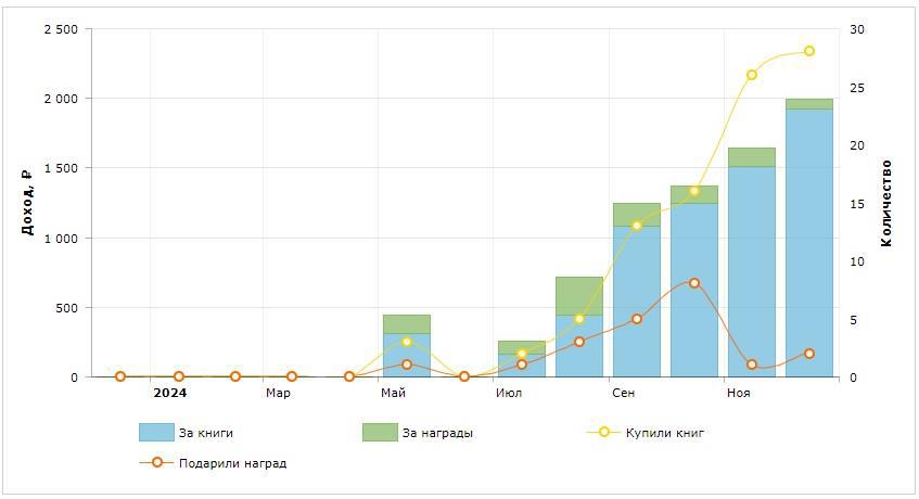 5) Приятно и то, что прибыль и количество проданных книг растёт с каждым месяцем. По чуть-чуть. Несерьёзно. Но растёт. Надеюсь, этот график подтверждает, что двигаюсь в правильном направлении.
