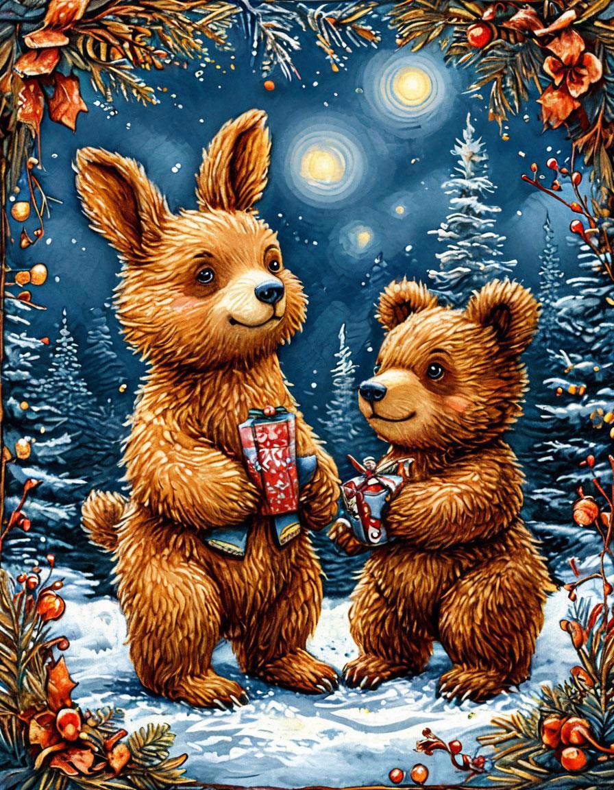 зайцы и мишки новогодняя открытка в стиле художника зарубина