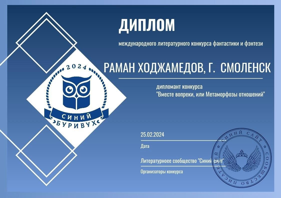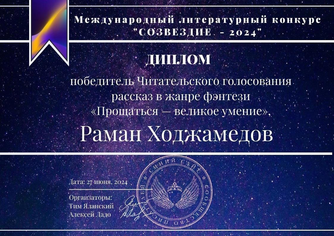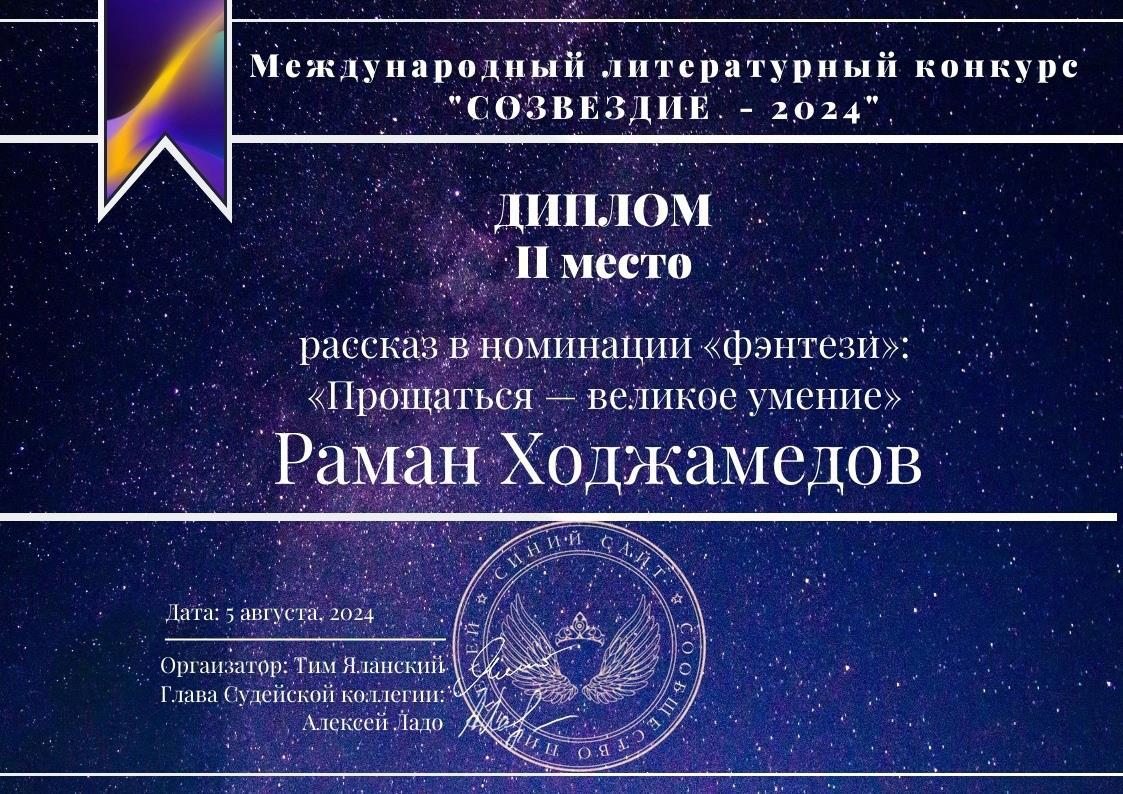 Гораздо больший успех имел "Прощаться — великое умение", занявший на конкурсе "Созвездие–2024" второе место в своей номинации и получивший приз читательских симпатий. Это своего рода прорыв, поскольку ближайшее подобное достижение пришлось ещё на 2022-й, когда "Доктор Ф." получил приз в молодёжной номинации и привёл меня в команду "Синего Сайта", которому я бесконечно благодарен и за критику, и за помощь, и за возможность участия не только как представляющий на суд свой опус, но и как тот, на чей суд свои произведения представляют другие.
