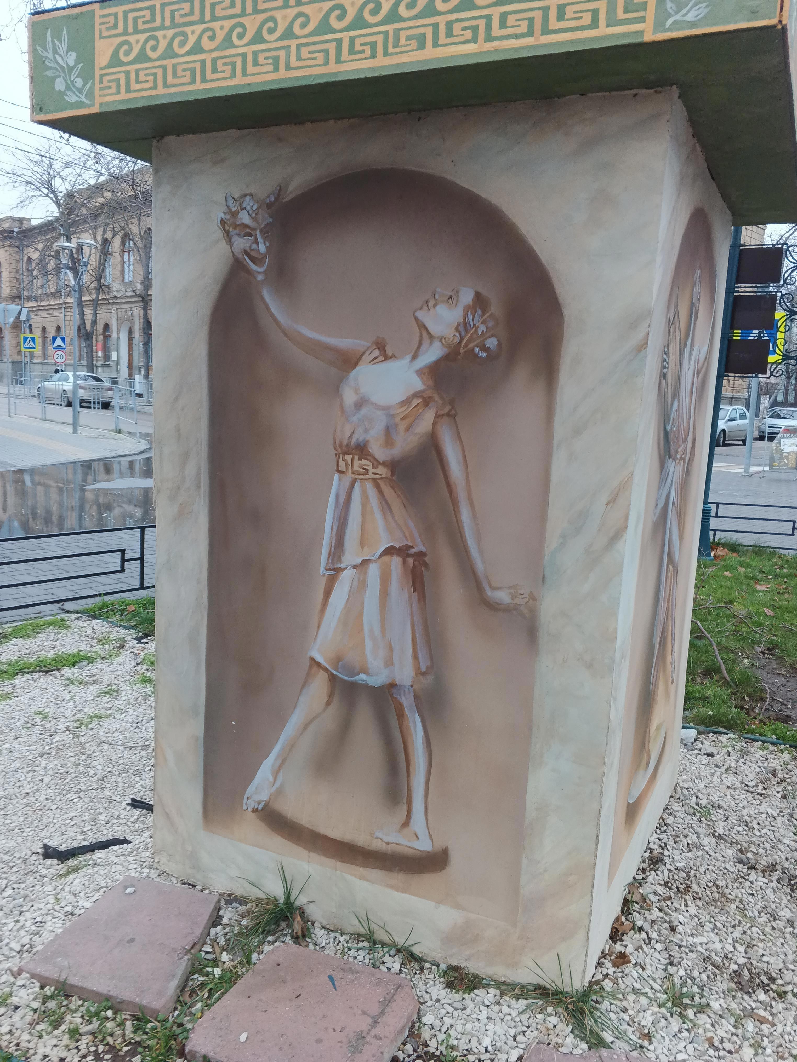 Кстати, если пройтись от этого строения буквально сто метров вперёд, то станет ясна тематика росписи. Здесь расположен детский театр "Золотой ключик". Здесь играют дети, школьники. Когда-то это был школьный кружок, который плавно перерос в реальный театр.