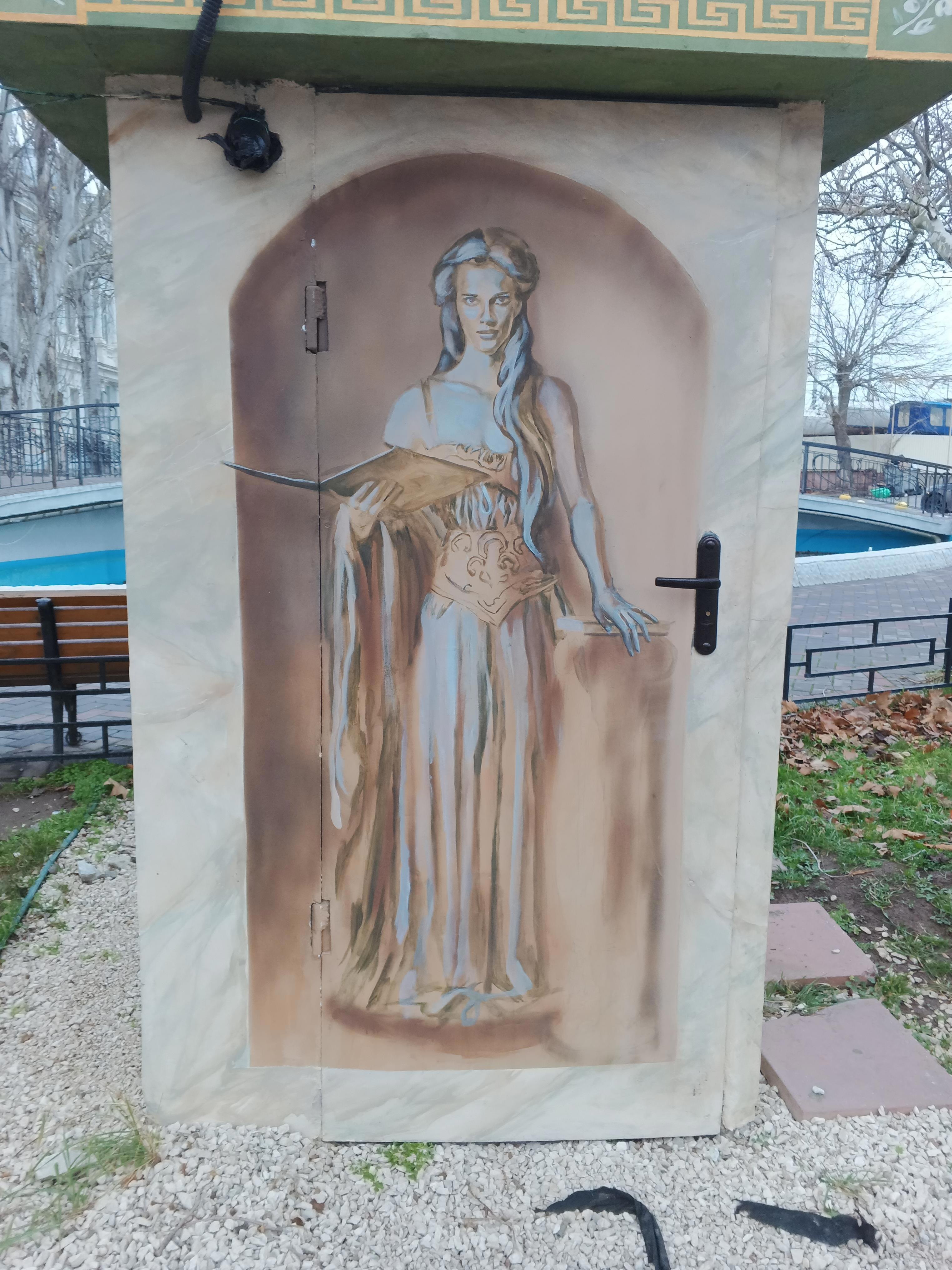 Чуть позже, мне объяснили евпаторийцы, что это подсобка дворника, здесь хранят мётлы, вёдра, лопаты... Креативно, ничего не скажешь.