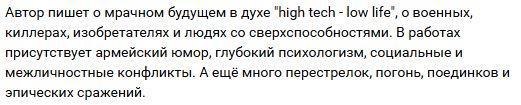 "Автор пишет о мрачном будущем в духе "high tech - low life", о военных, киллерах, изобретателях и людях со сверхспособностями. В работах присутствует армейский юмор, глубокий психологизм, социальные и межличностные конфликты. А ещё много перестрелок, погонь, поединков и эпических сражений."