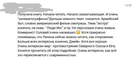 "Получила книгу. Начала читать. Начало захватывающее. И очень "кинематографично"!Дальше немного темп снизился. Армейский быт, словно американский фильм смотришь. Тема "экстра" конечно, не нова - "Люди Икс" и пр. Но персонажи очень живые. Коммунист Соловей очень насмешил. Хотя прекрасно понимаешь, что Ленина сейчас можно читать, как откровение.