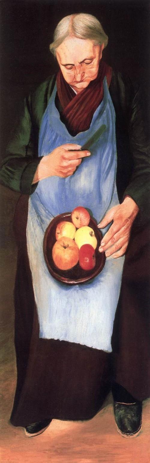 ![]() Экспериментировал с размером и формой. Многие пейзажи выполнены в натуральную величину. Это гигантские полотна до 30 квадратных метров. Есть совершенно нестандартные работы. В том же Мюнхене Чонтвари написал портрет старухи, которая чистит яблоки. Умышленно выбрал нехарактерный удлиненный холст. Кажется, что картину обрезали по бокам, но если приглядеться, такой масштаб придает особую выразительность композиции, пластичность силуэту.