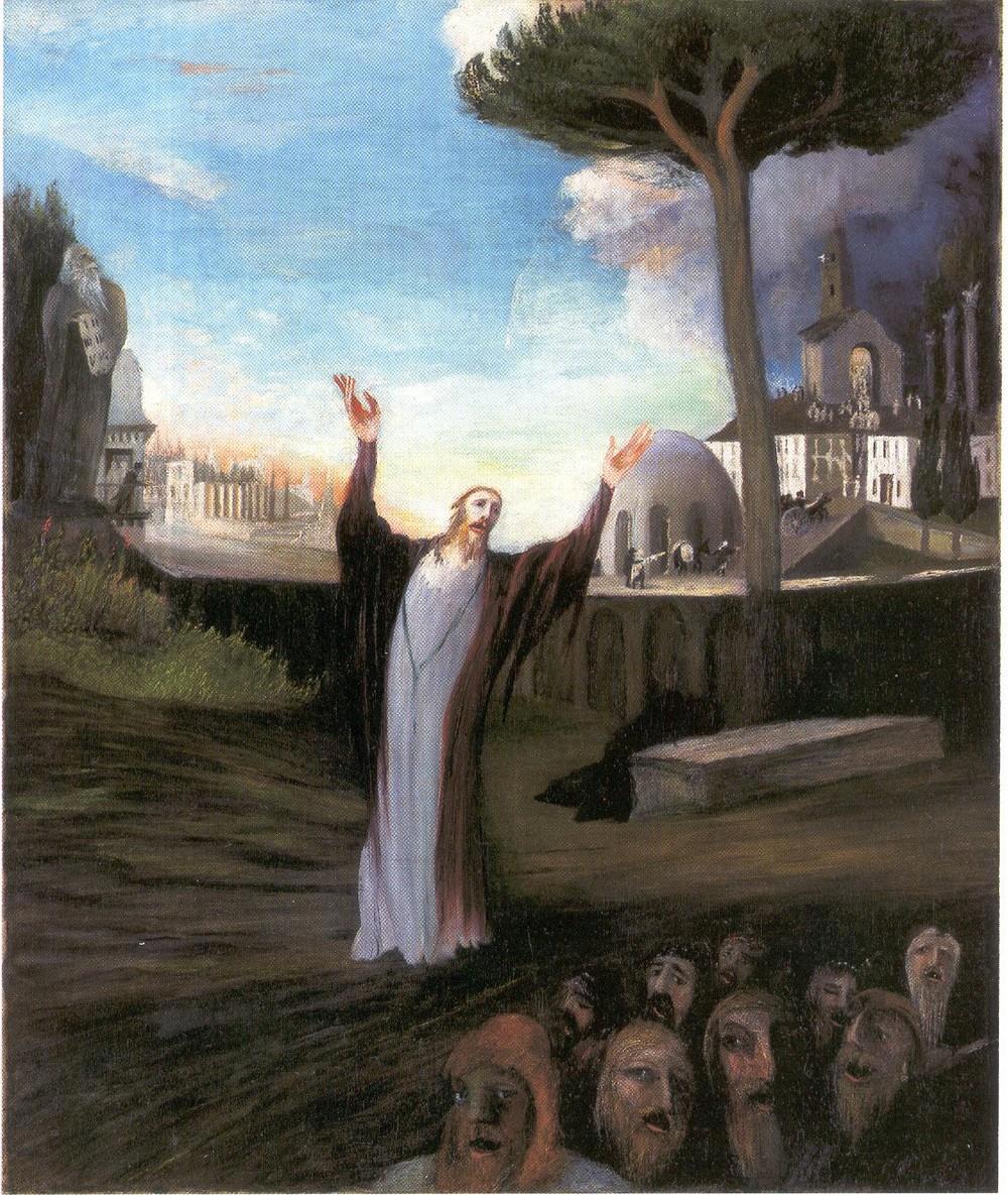 Левая сторона – умиротворенный старец, который сложил руки в молитве, море и Везувий за его спиной спокойны.