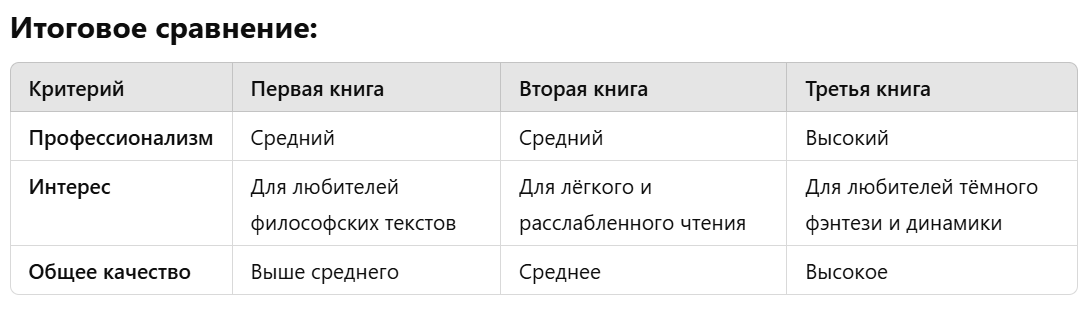 В общем, если кратко – я скормил нейросети три книги и попросил провести сравнительный анализ.