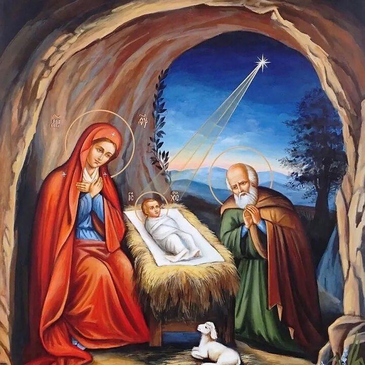 Де́ва днесь Пресу́щественнаго ражда́ет,/ и земля́ верте́п Непристу́пному прино́сит,/ А́нгели с па́стырьми славосло́вят,/ волсви́ же со звездо́ю путеше́ствуют:/ нас бо ра́ди роди́ся// Отроча́ Мла́до, Преве́чный Бог.