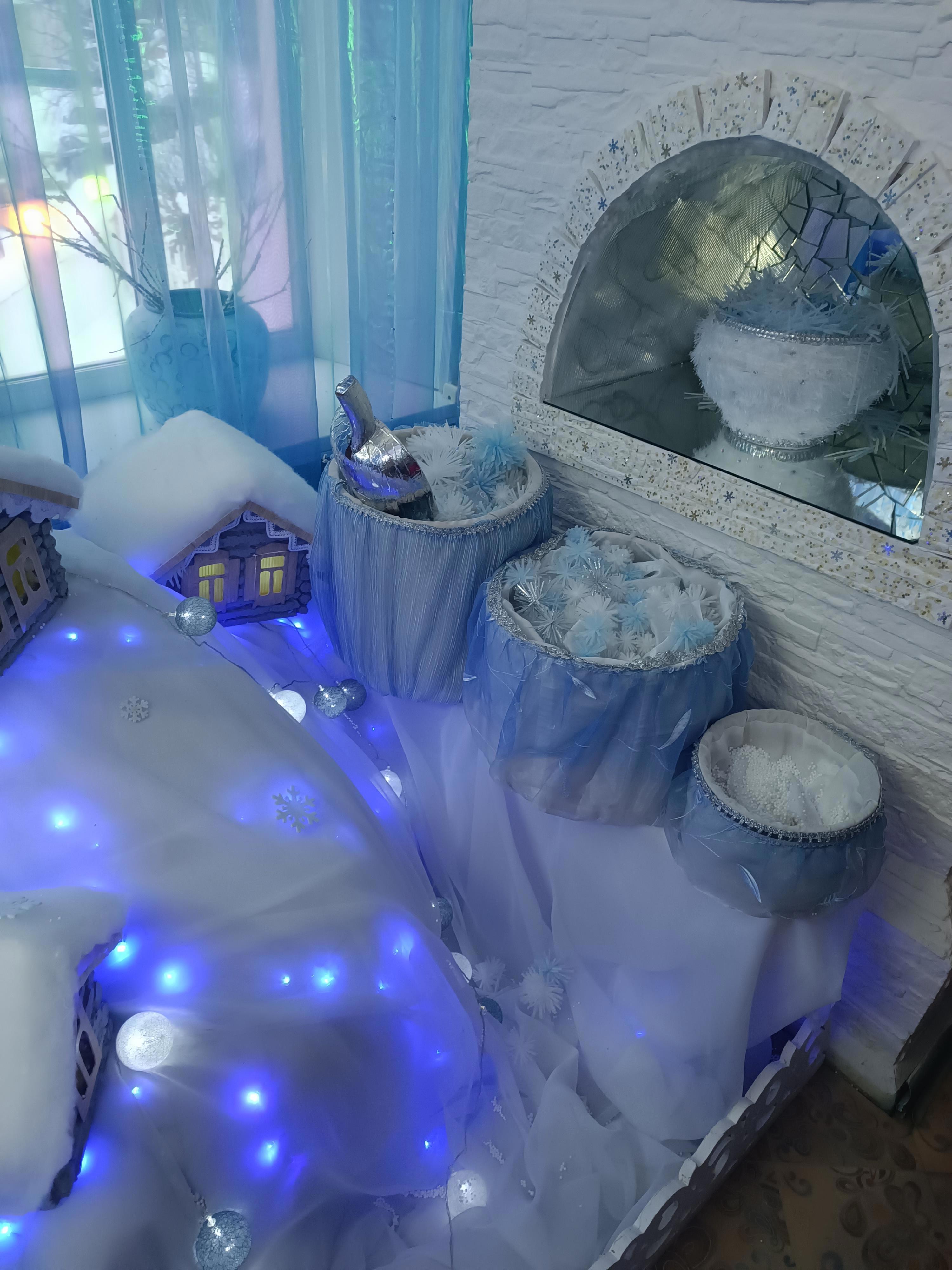 Я даже на троне Зимушки посидела, желание загадала. Потом мы спустились в подвал, где хранятся соленья. Помните ведь, что Зима снежки солит в берёзовых кадушках?)