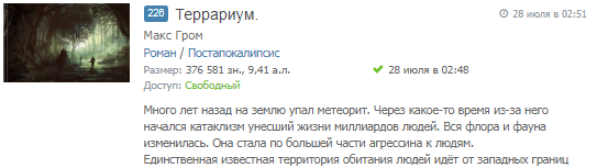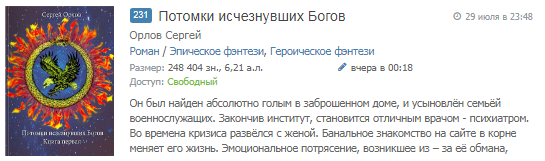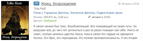 7. Ябзашёл, но автор говорит, что полная версия — 30+ а.л. А краткость — сестра таланта. Единственный роман, для которого я сделал исключение, это «Рождение экзекутора». Но там хотя бы размах на эпик с целой галактикой. Плюс, автор удаляет критические комменты (если я правильно понял, удалили даже рецензию), что отшибает желание читать, я ж не могу прочитать и не помахать своим мнением.