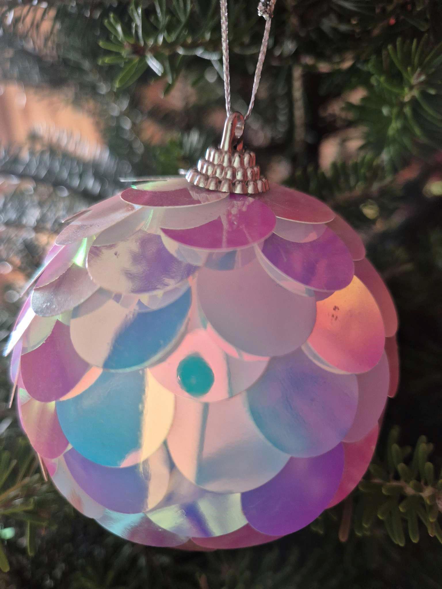 А это дешево и сердито. Считаю, что шарик с чешуей вписывается в мою морскую коллекцию. Опять вопрос, почему он блестит розовым. Это фольга (на легком пенопласте). Очень красивый