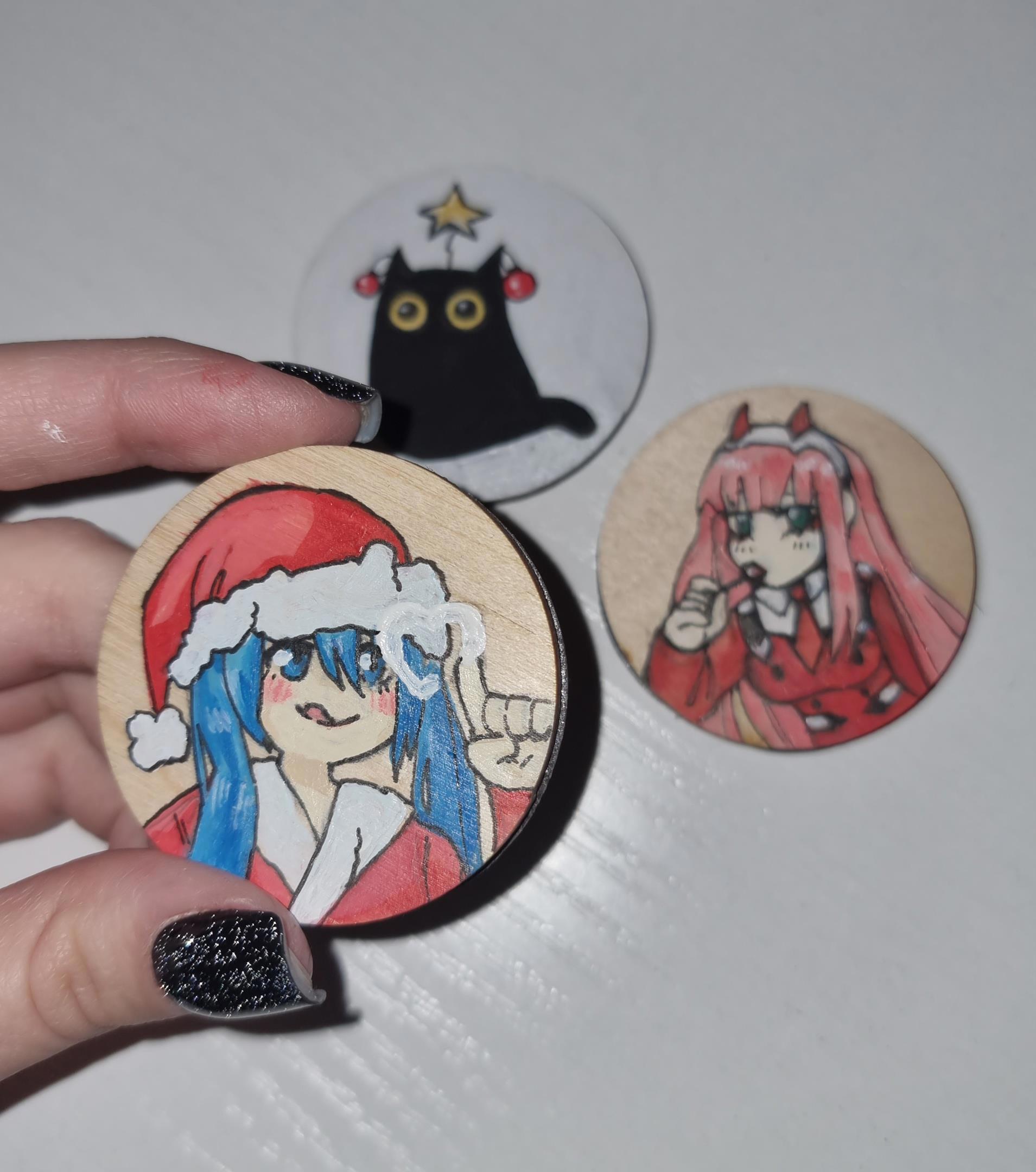 Кружки, дакимакуры, печатные стикеры, значки и многое другое которые можно сделать на заказ.