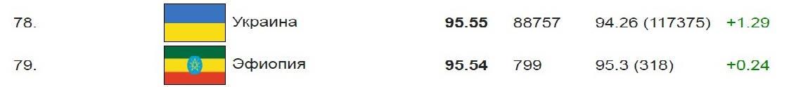 А где Украина-то… А! Нашёл! Могучим интеллектуальным рывком они смогли обогнать Эфиопию в битве за 78 строчку. Правда эфиопы отправили на соревнования чисто символическую сборную…